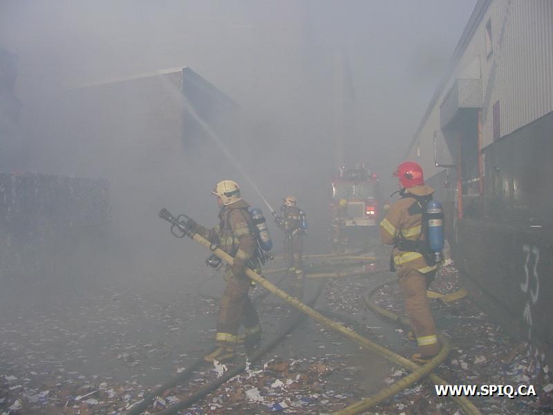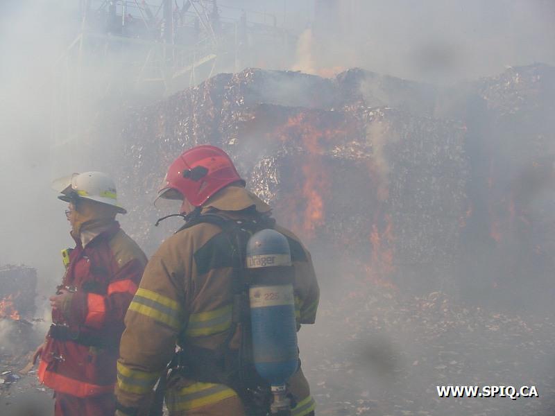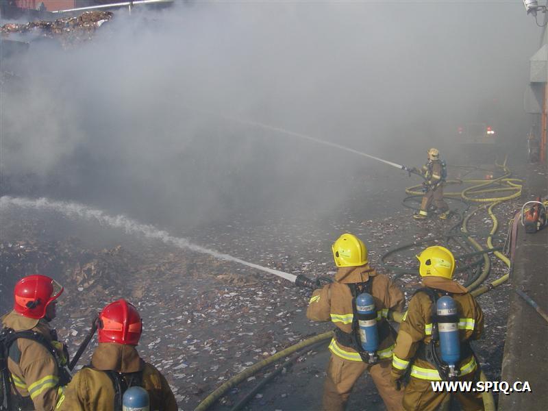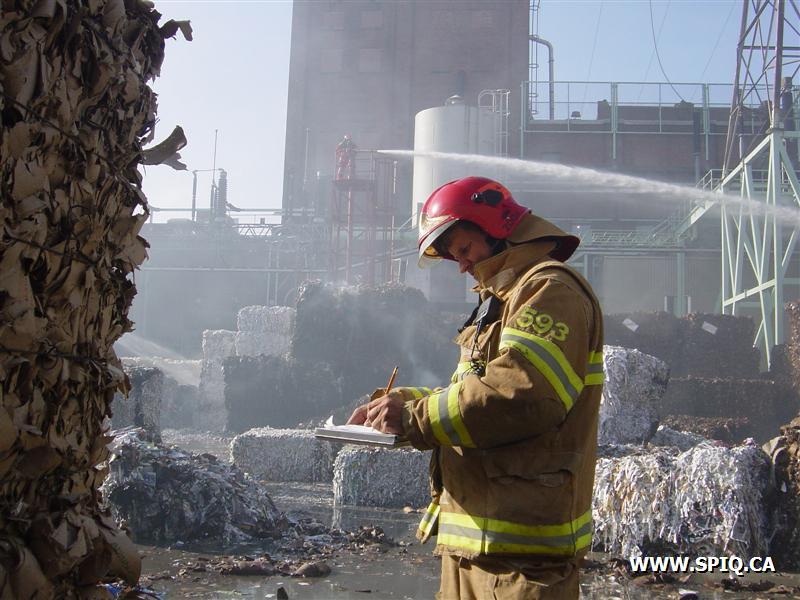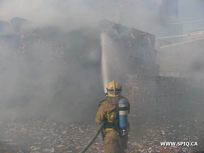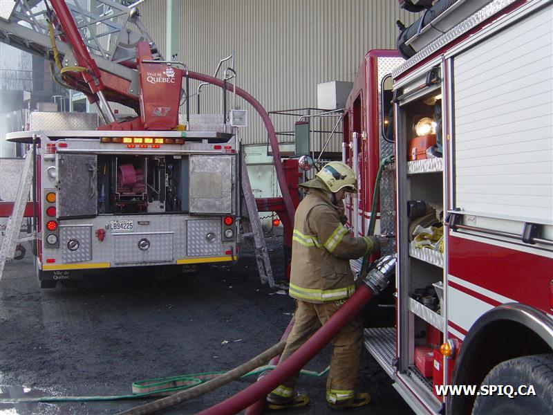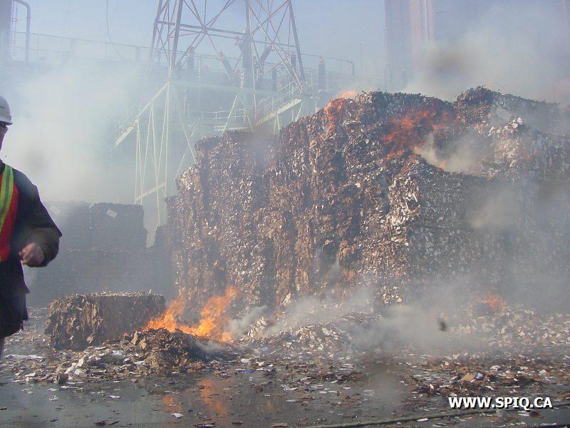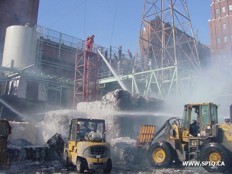 Feu dans des centaines de ballots de papier dans la cour, du côté de la rivière St-Charles, de l'usine Stadacona. À l'arrivée des unités de la caserne 2, la 2ème alarme est donnée. Quelques membres de la brigade de pompiers de l'usine étaient déjà à l'oeuvre, notamment avec un jet déluge du haut d'une tour.