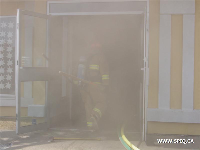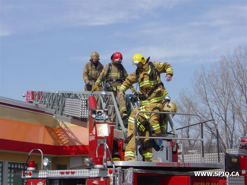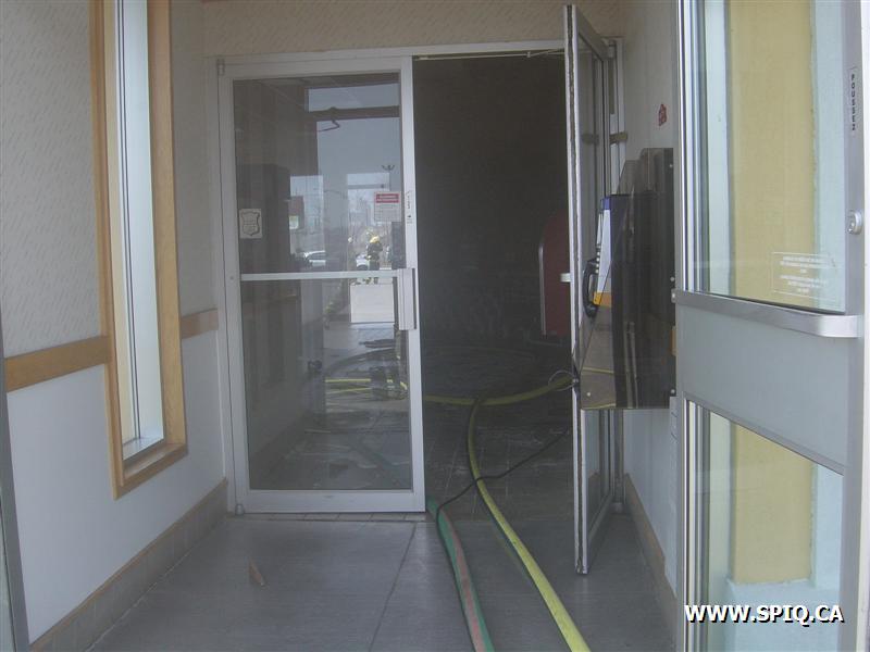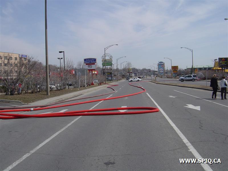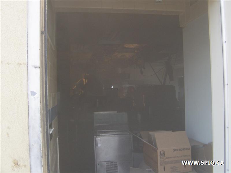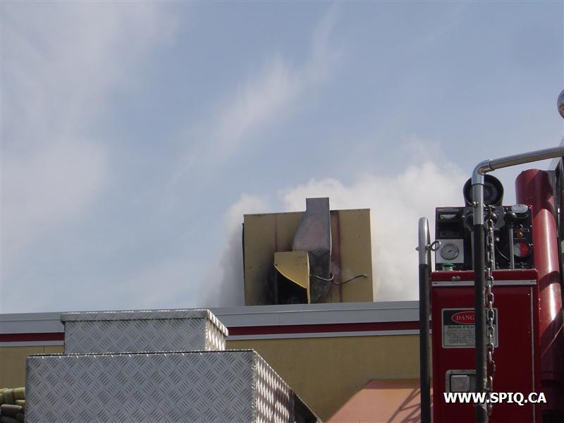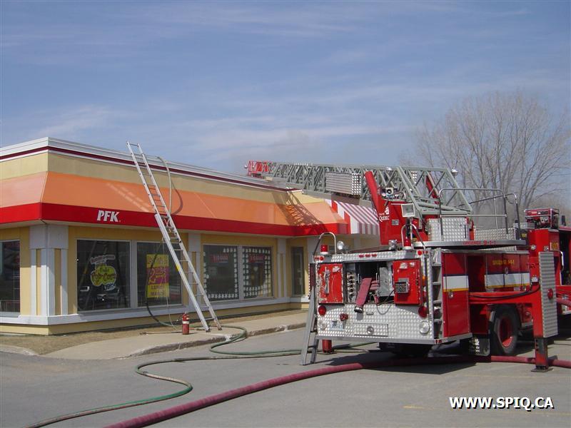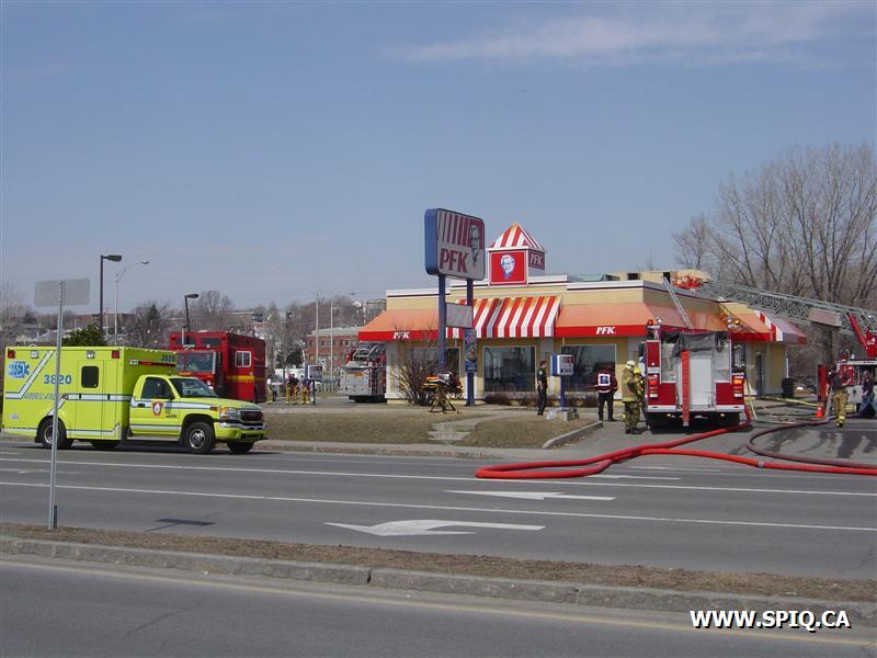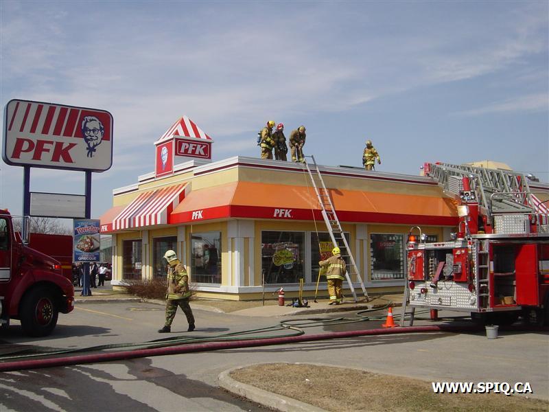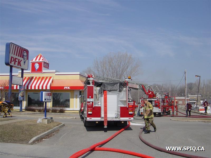 Feu dans la hotte d'évacuation de fumée du restaurant PFK. À son arrivée, le 143 donne la fumée apparente et l'intervention nécessaire: quelques instants par la suite, voyant les conditions se détériorer, il demande la 2ème alarme.