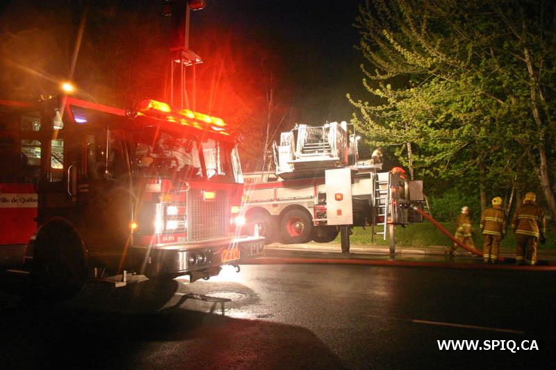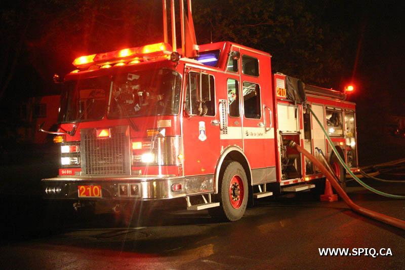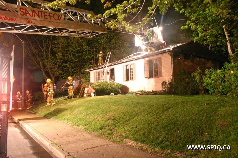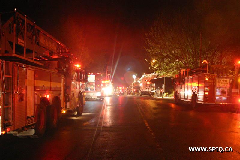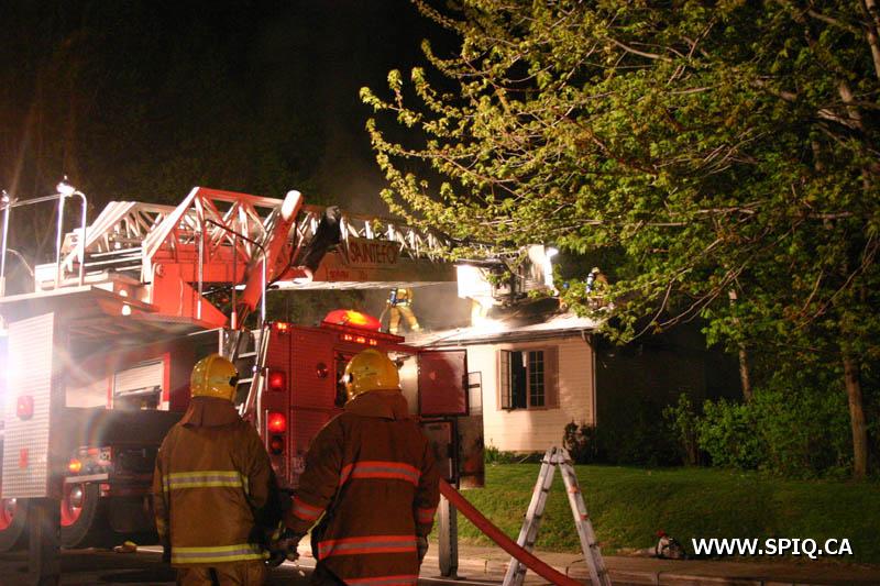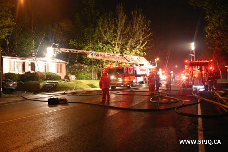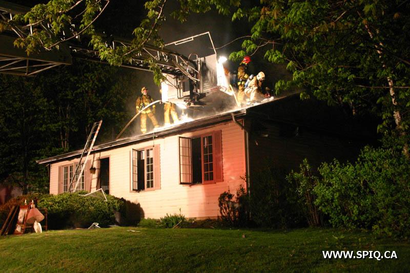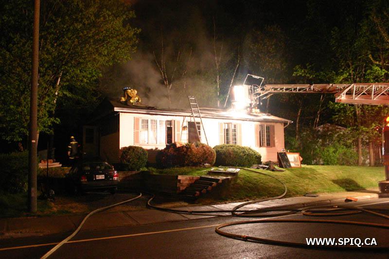 L'appel est entré par la résidente qui mentionne qu'elle voit des flammes et beaucoup de fumée dans la maison. Le premier véhicule arrivé sur les lieux fait rapport de flammes sortant du toit, la 2è alarme est alors demandée.