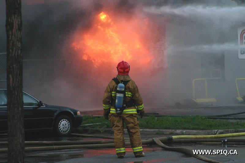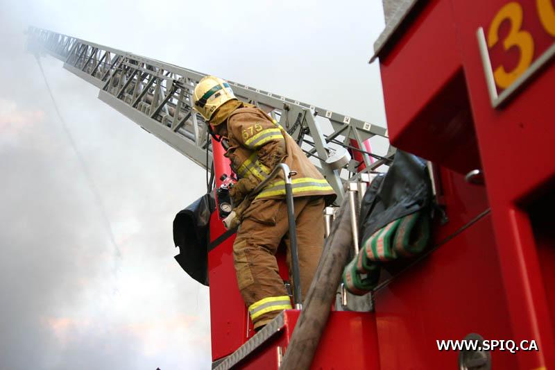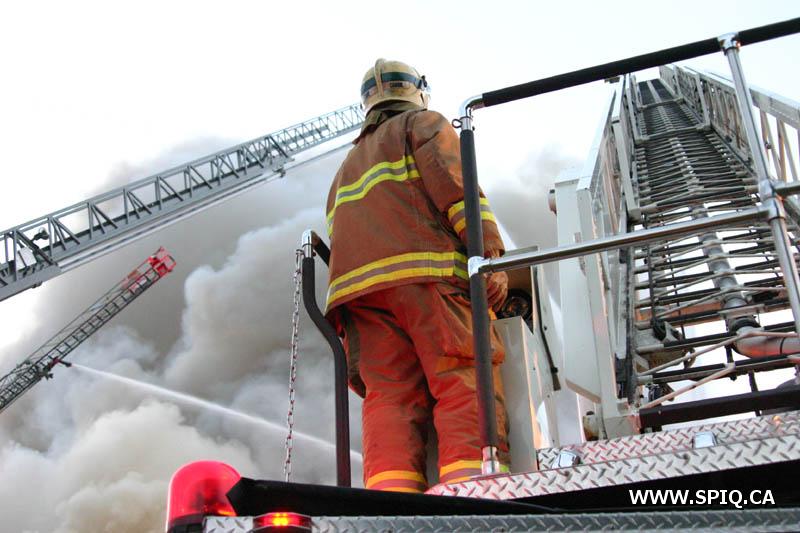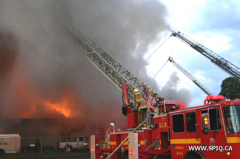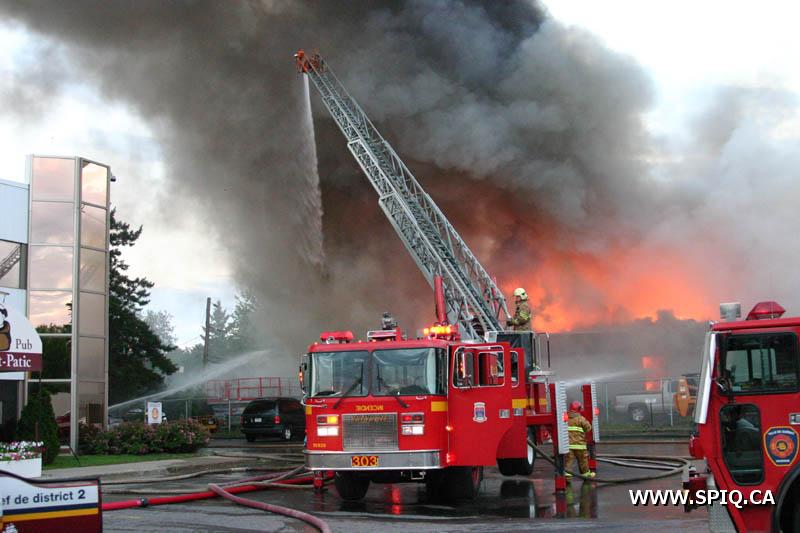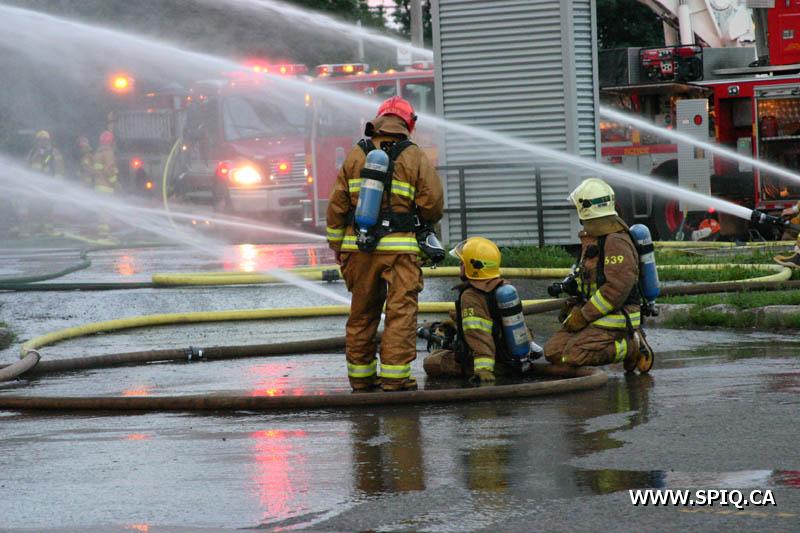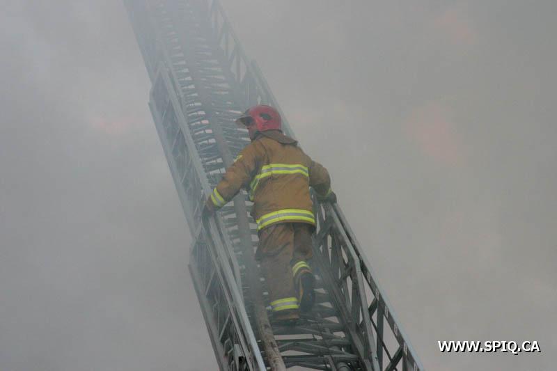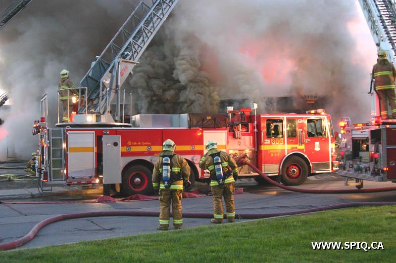 A un certain moment, les flammes étaient tellement intenses, qu'il était interdit pour les pompiers de demeurer devant le batiment pour des raisons de sécurité. En tout cinq jet déluges ont été utilisés, quatre à partir du devant du batiment sur Hamel, et un 5e à partir d'une rue dans le quartier résidentiel en arrière du batiment affecté par l'incendie (dernière photo du reportage). Plusieurs résidences du quartier ont du etre évacuées.