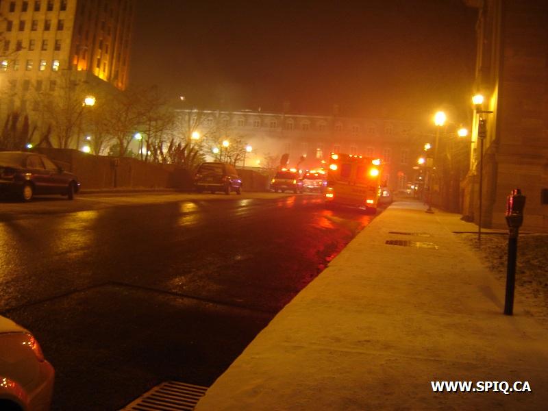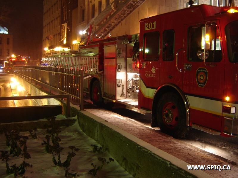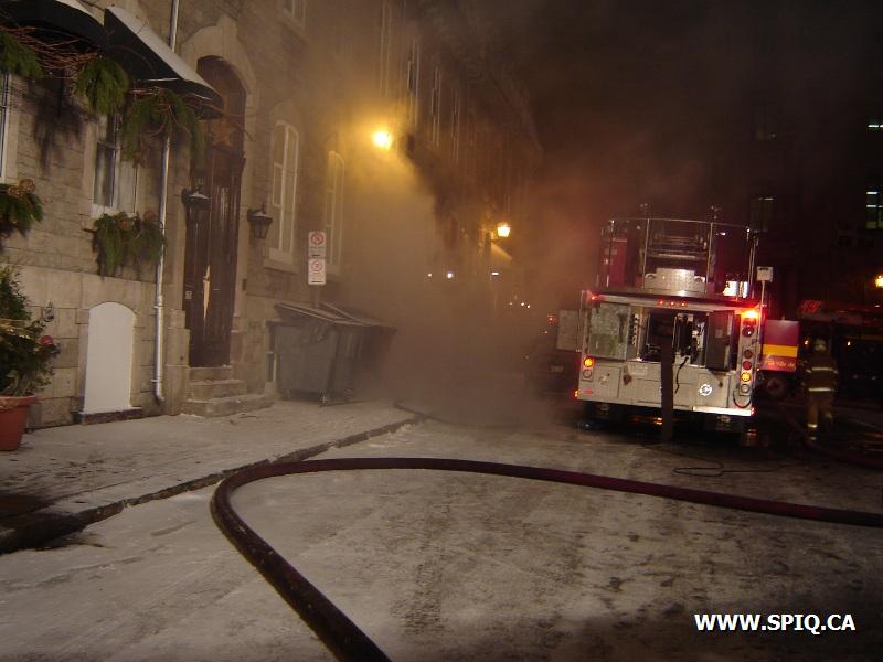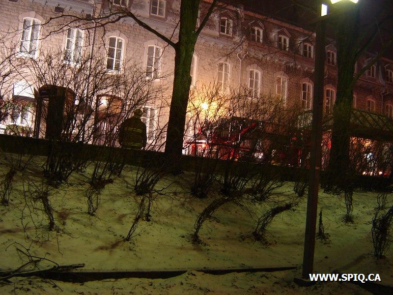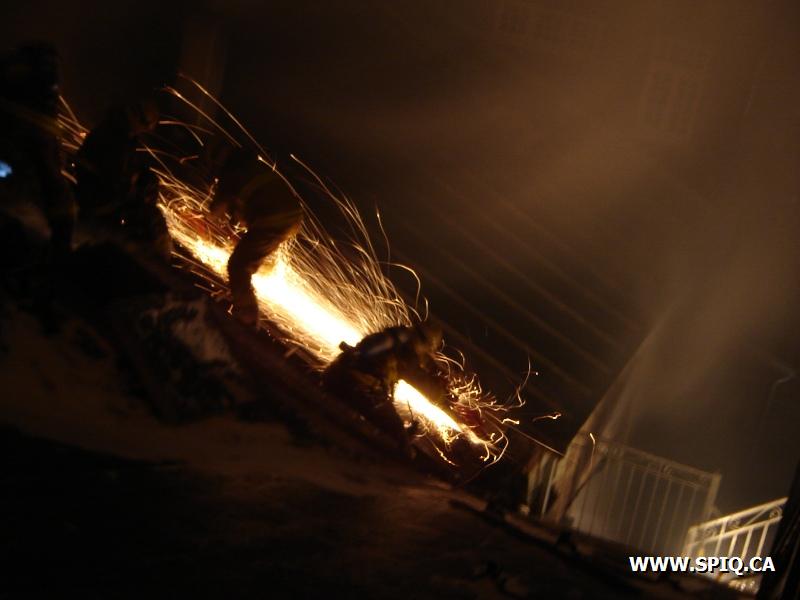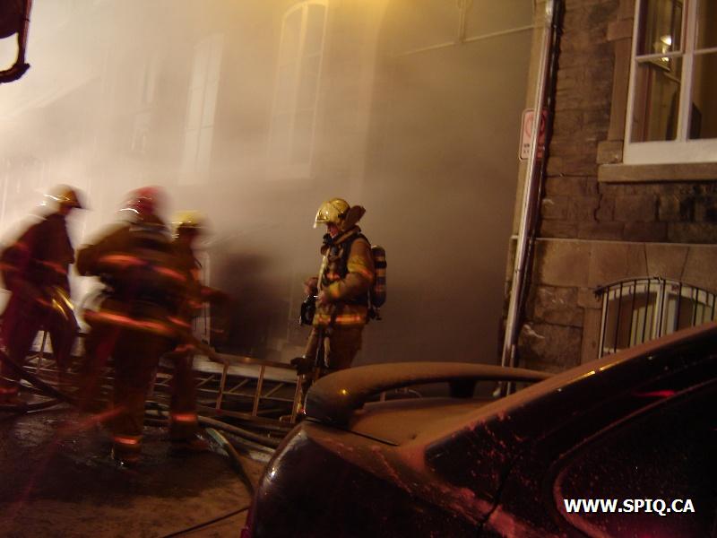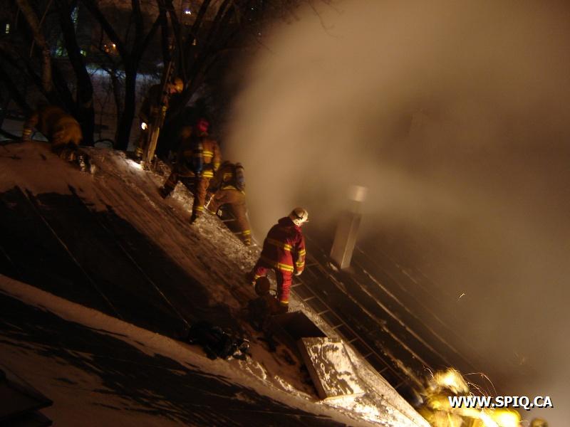 Ce fut ce que l'on appelle communément un "feu de misère" en raison de la difficulté à atteindre le foyer de l'incendie partout dans la vieille structure. Le toit en pente forte et complètement glacé a forcé les hommes à travailler avec des échelles à toit et des cables de protection.