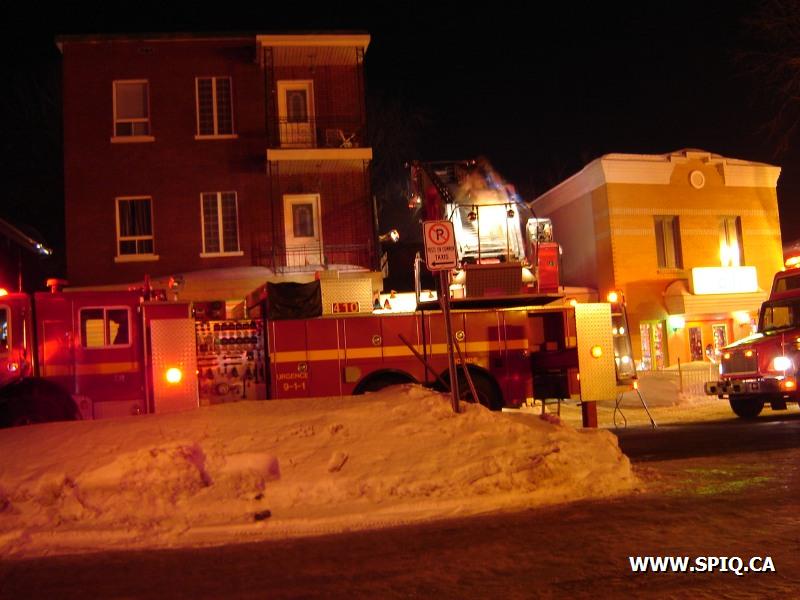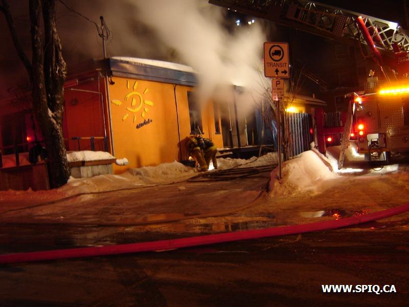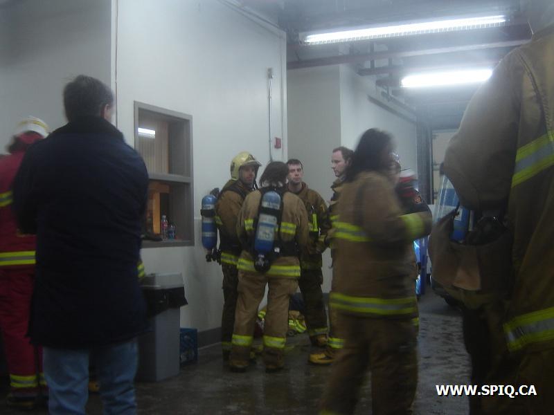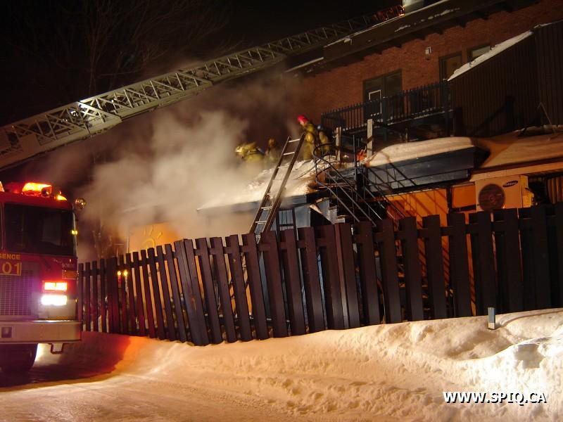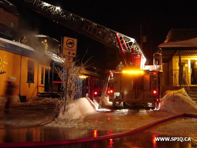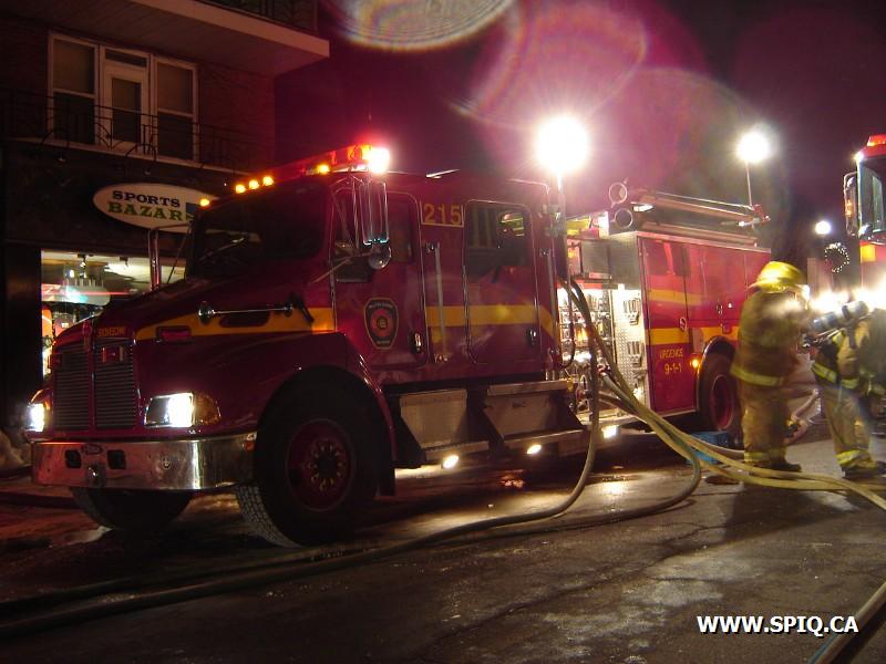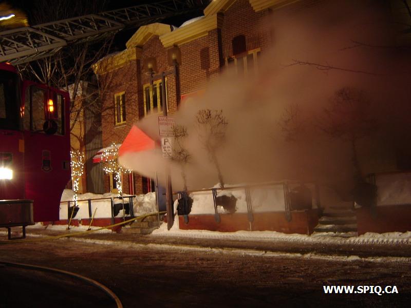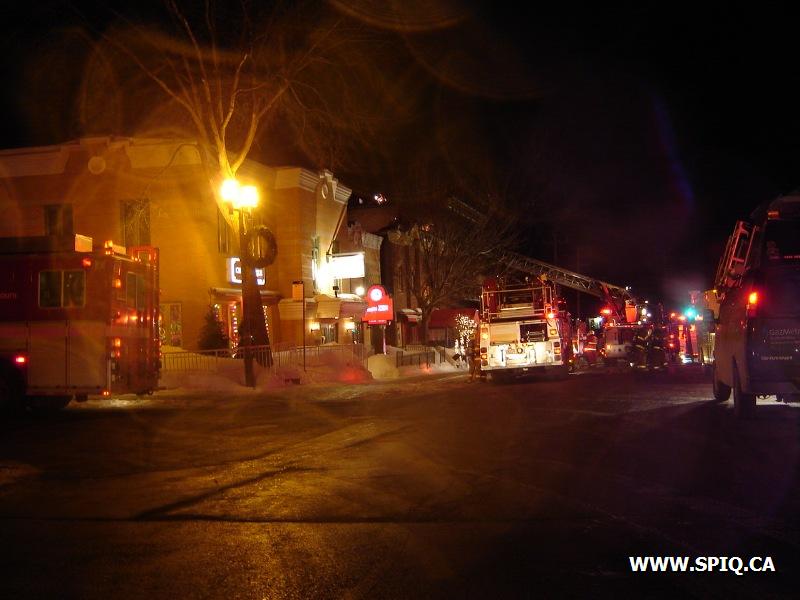Immeuble de 3 étages de grande superficie faisant le coin de l'Avenue Maguire et du Chemin St-Louis avec le restaurant Montégo au rez-de-chaussée. Constatant une fumée importante à l'intérieur , le 215 demande la 2ème alarme à son arrivée.