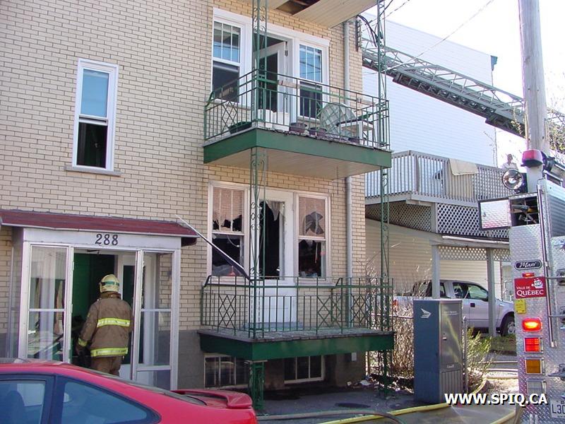 Immeuble à logements de 3 étages: le feu est dans un appartement du 1er. Les flammes sont localisées et tapées rapidement. Par contre l'accumulation de fumée au 3ème étage a fait craindre un moment que le feu ait pû passer par un mur, mais il n'en fut rien.