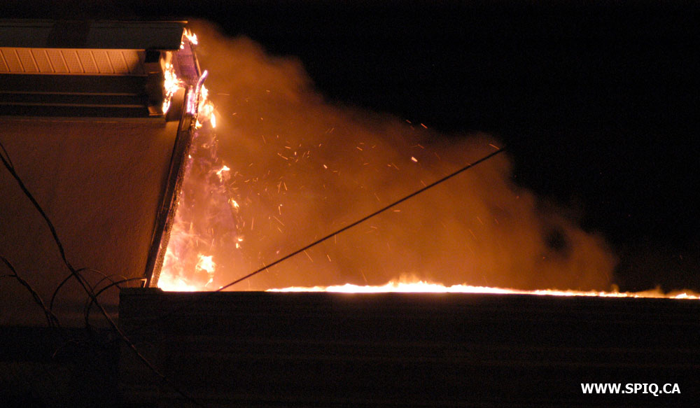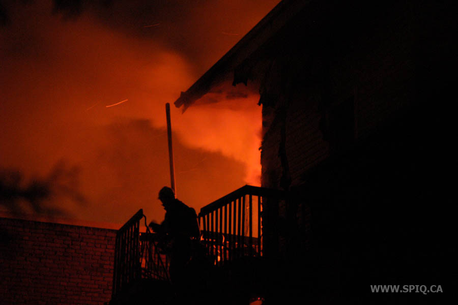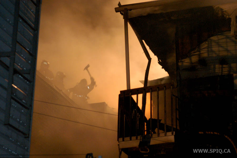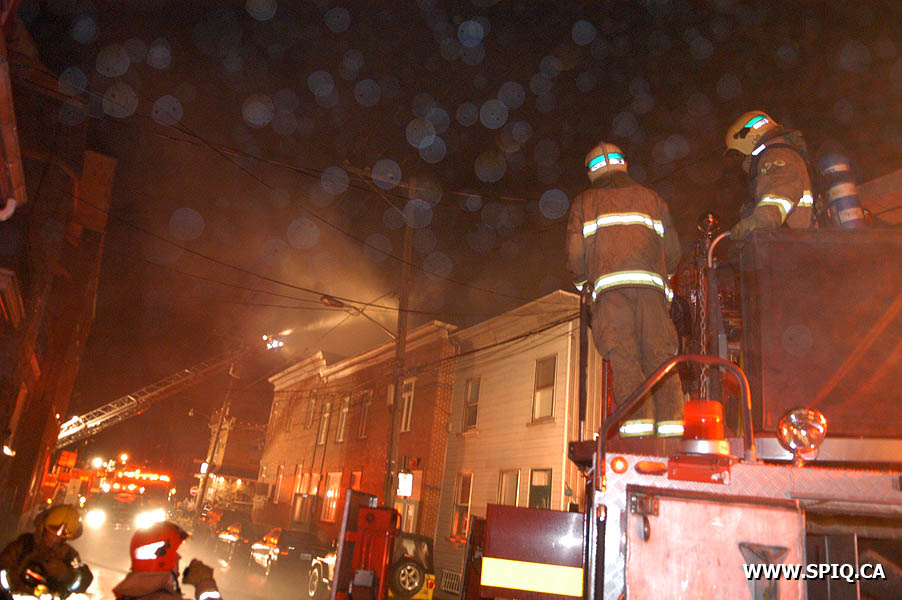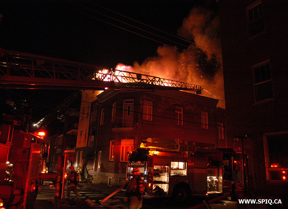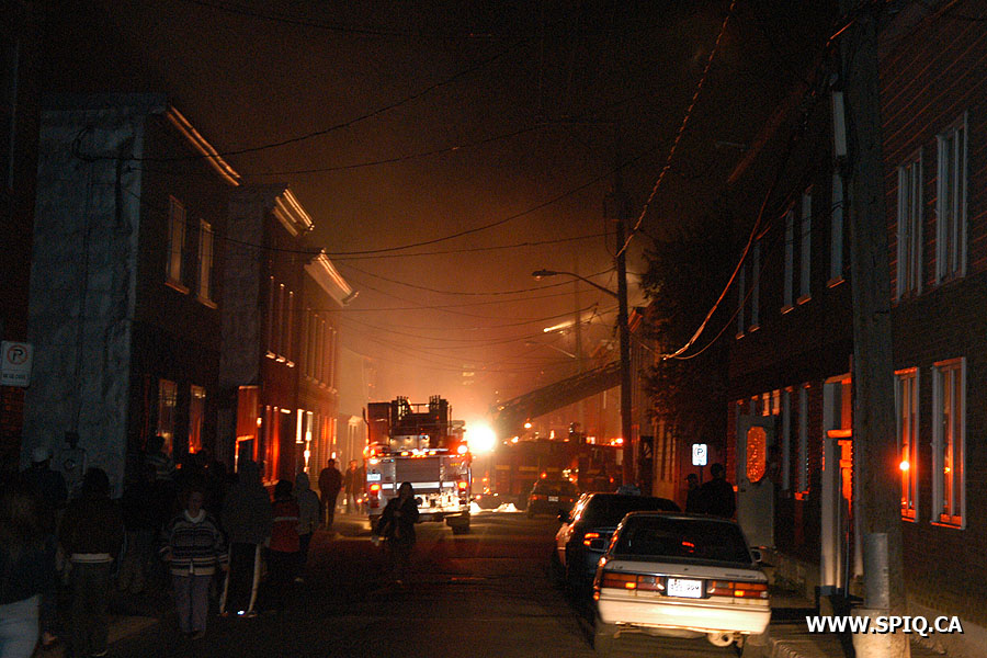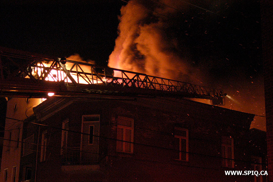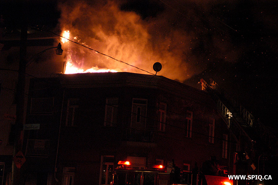Les informations initiales font état de fumée noire sortant de l'édifice au 555 rue Kirouac. Par la suite d'autres informations signalent qu'il y a du feu et que les passants font du sauvetage. Lorsque le chef arrive sur les lieux, il confirme qu'une intervention est nécessaire, feu éclaté au rez-de-chaussée. La situation dégénère ensuite très rapidement, le feu semble se propager, et l'évacuation des édifices n'est pas confirmée: la deuxième alarme est demandée. À peine un instant plus tard, le toit s'embrase, et deux autres alarmes sont demandées presque en rafale. L'élément destructeur semble avoir trouvé sa voie par des escaliers et des galeries. Quand les équipes de la deuxième alarme se déploient et que les autres arrivent, le feu est déjà particulièrement violent, poussé par le vent, surgissant avec force du toit des édifices au coin de la rue, et offrant une menaçante pluie de tisons sur la rue Kirouac. Les pompiers ont réussi à stopper cette propagation fulgurante mais le mal était déjà fait pour les édifices atteints, particulièrement celui sur St-Luc qui a été lourdement endommagé.