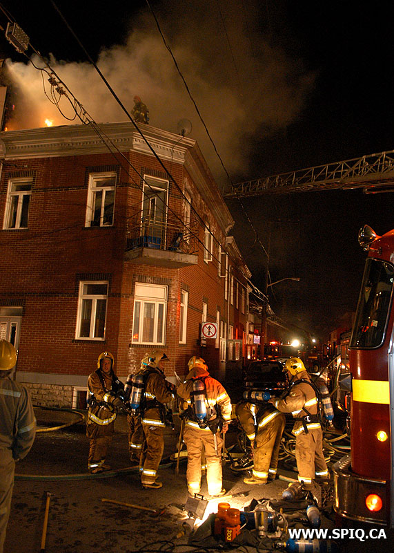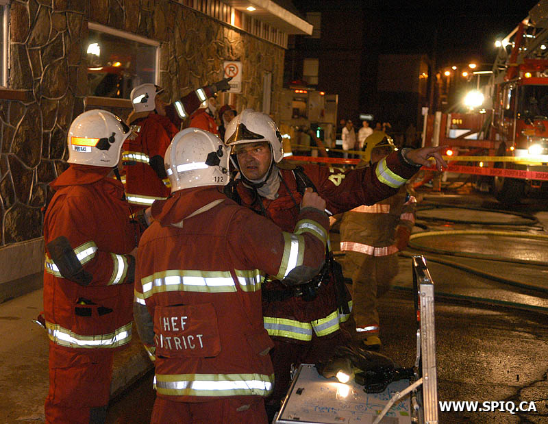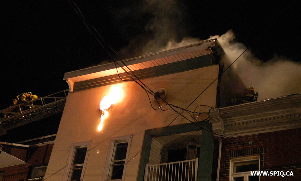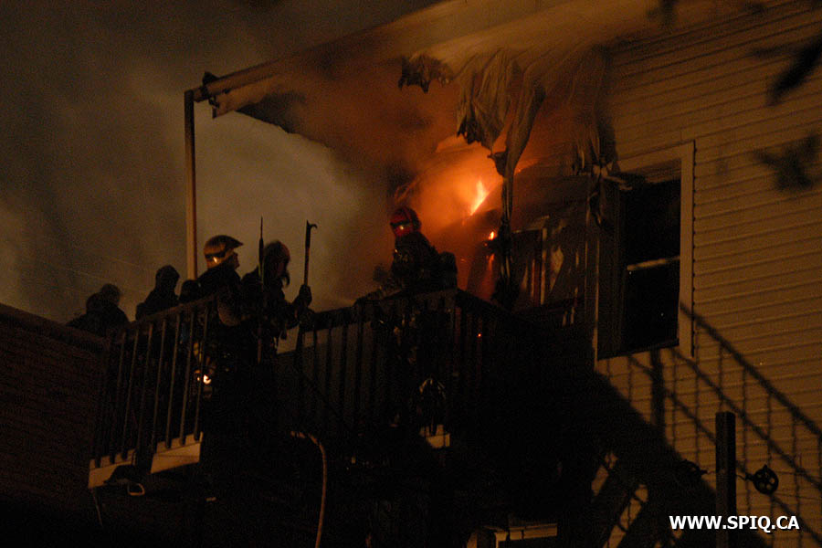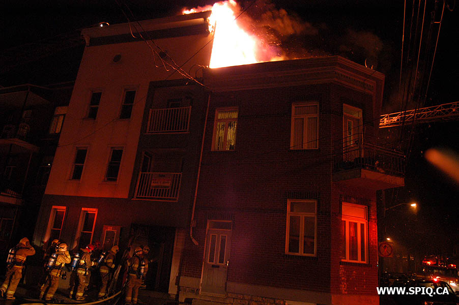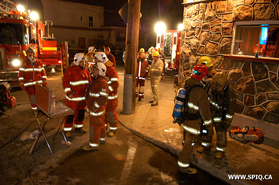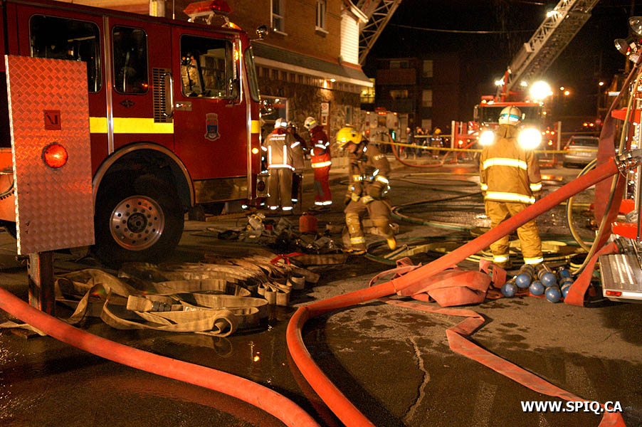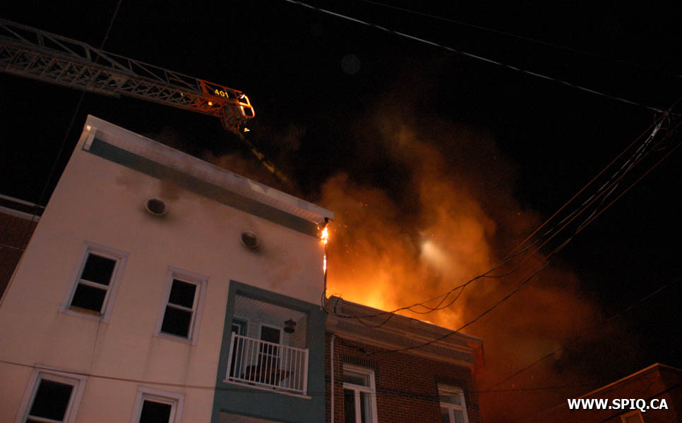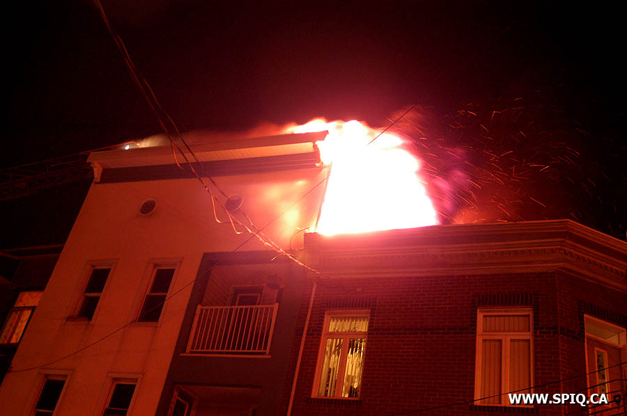 Les informations initiales font état de fumée noire sortant de l'édifice au 555 rue Kirouac. Par la suite d'autres informations signalent qu'il y a du feu et que les passants font du sauvetage. Lorsque le chef arrive sur les lieux, il confirme qu'une intervention est nécessaire, feu éclaté au rez-de-chaussée. La situation dégénère ensuite très rapidement, le feu semble se propager, et l'évacuation des édifices n'est pas confirmée: la deuxième alarme est demandée. À peine un instant plus tard, le toit s'embrase, et deux autres alarmes sont demandées presque en rafale. L'élément destructeur semble avoir trouvé sa voie par des escaliers et des galeries. Quand les équipes de la deuxième alarme se déploient et que les autres arrivent, le feu est déjà particulièrement violent, poussé par le vent, surgissant avec force du toit des édifices au coin de la rue, et offrant une menaçante pluie de tisons sur la rue Kirouac. Les pompiers ont réussi à stopper cette propagation fulgurante mais le mal était déjà fait pour les édifices atteints, particulièrement celui sur St-Luc qui a été lourdement endommagé.