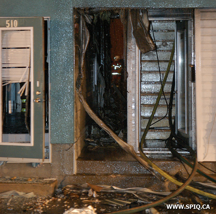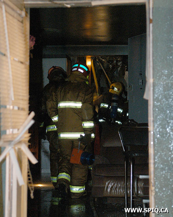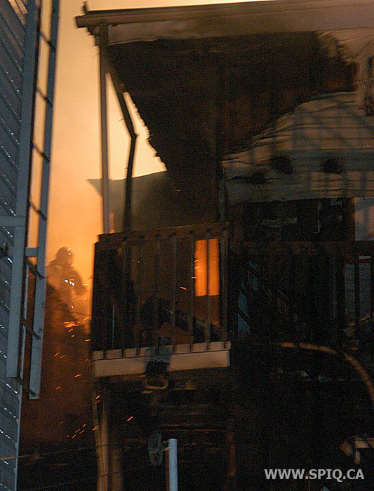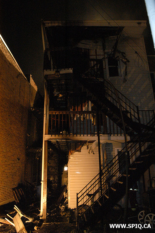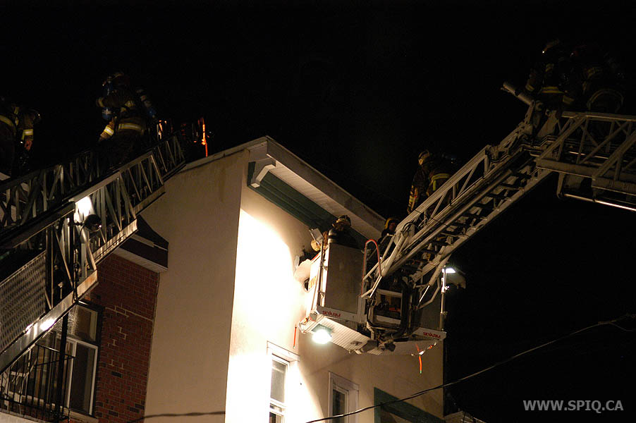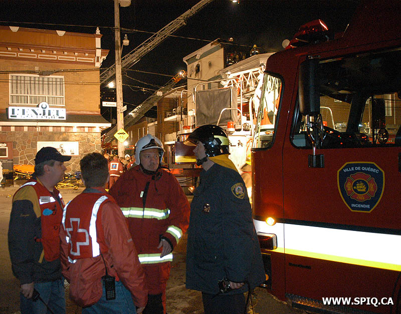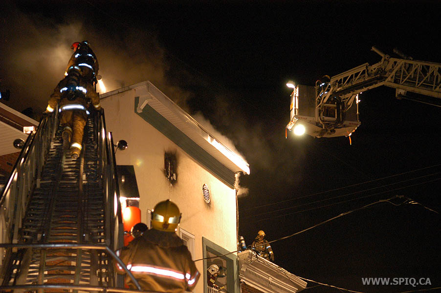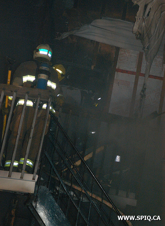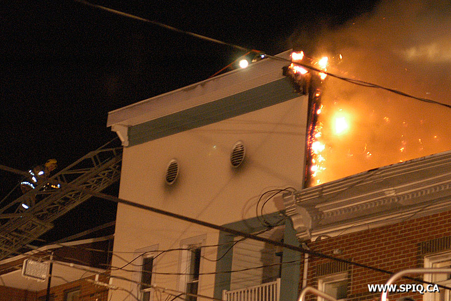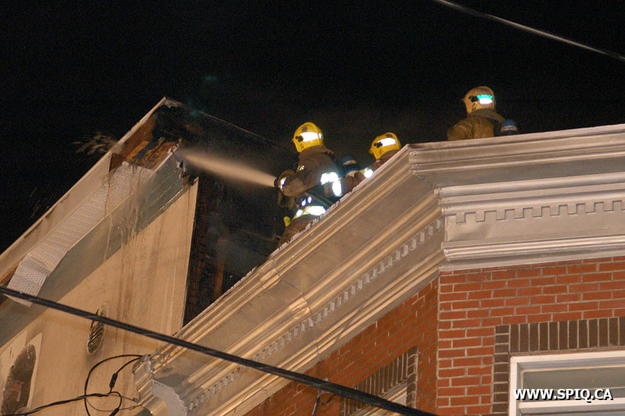 Les informations initiales font état de fumée noire sortant de l'édifice au 555 rue Kirouac. Par la suite d'autres informations signalent qu'il y a du feu et que les passants font du sauvetage. Lorsque le chef arrive sur les lieux, il confirme qu'une intervention est nécessaire, feu éclaté au rez-de-chaussée. La situation dégénère ensuite très rapidement, le feu semble se propager, et l'évacuation des édifices n'est pas confirmée: la deuxième alarme est demandée. À peine un instant plus tard, le toit s'embrase, et deux autres alarmes sont demandées presque en rafale. L'élément destructeur semble avoir trouvé sa voie par des escaliers et des galeries. Quand les équipes de la deuxième alarme se déploient et que les autres arrivent, le feu est déjà particulièrement violent, poussé par le vent, surgissant avec force du toit des édifices au coin de la rue, et offrant une menaçante pluie de tisons sur la rue Kirouac. Les pompiers ont réussi à stopper cette propagation fulgurante mais le mal était déjà fait pour les édifices atteints, particulièrement celui sur St-Luc qui a été lourdement endommagé.