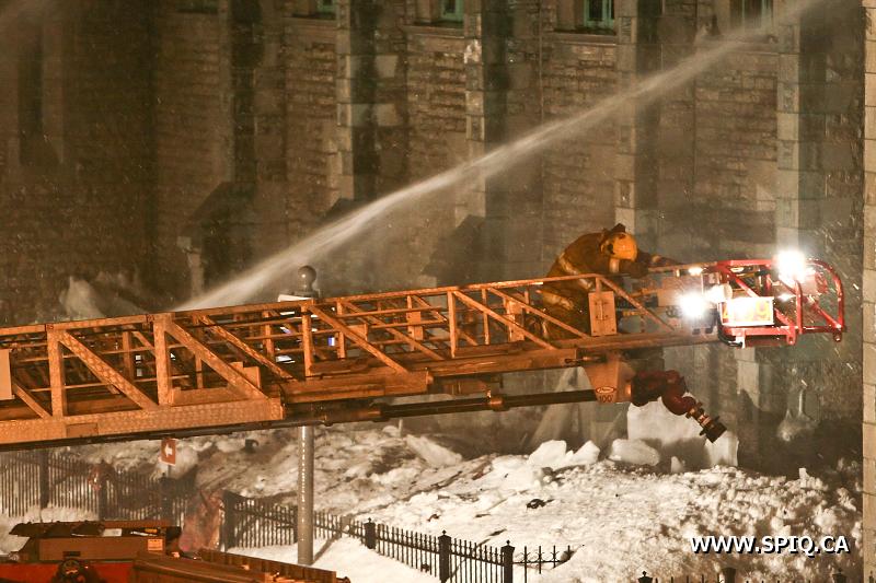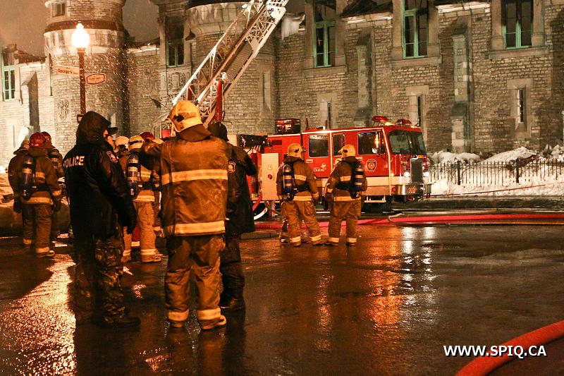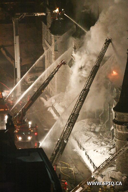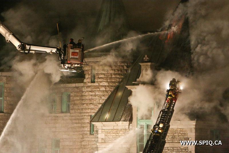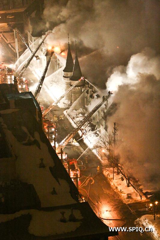 Catastrophique incendie pour Québec en cette année du 400è anniversaire. L'un des plus beaux édifices historiques de la Ville a complètement été anéanti par le feu. Construit en 1885 par l'architecte E. E. Taché, le magnifique bâtiment était l'un des fleurons architecturaux de la vieille ville.