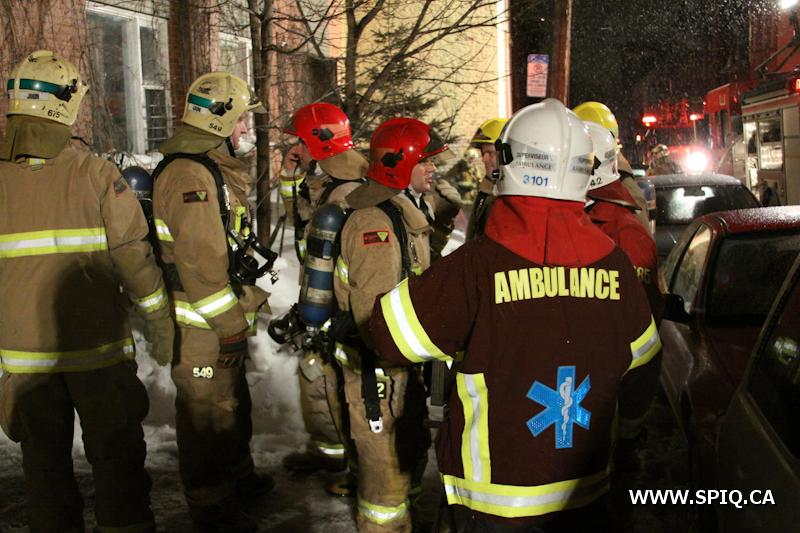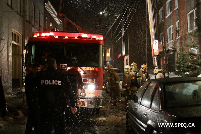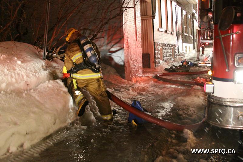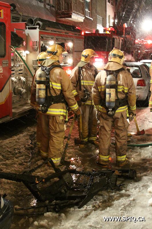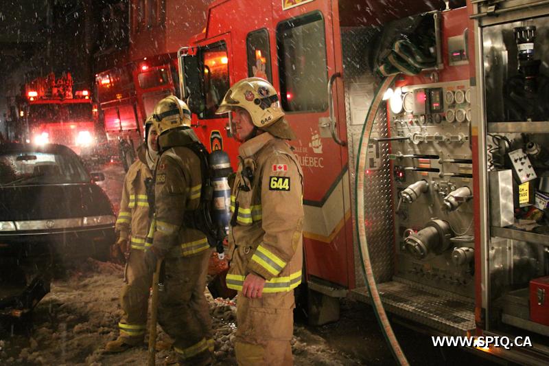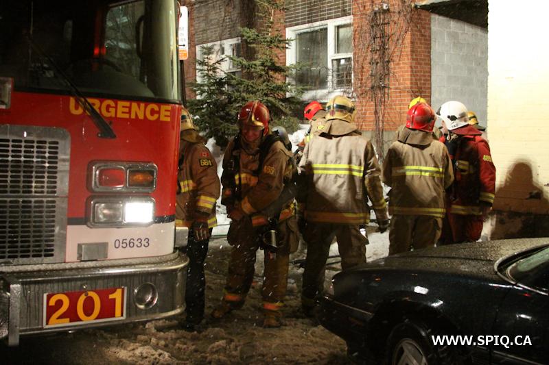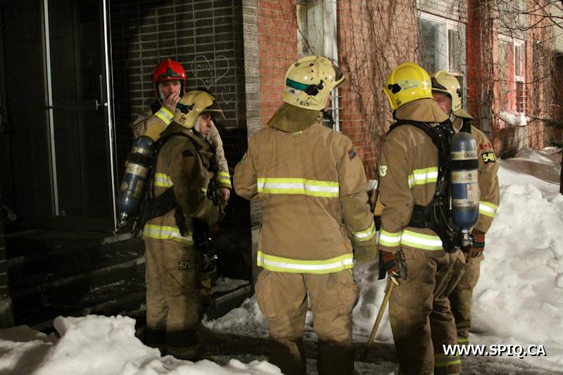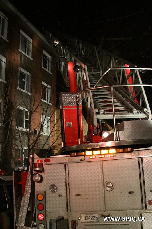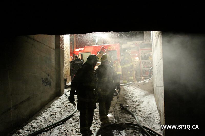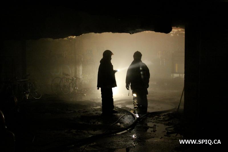 Sans prendre de chance, le chef Jobin (142) demande de compléter une 2e alarme. Le feu risque de se propager dans la structure du bâtiment par des conduits en plastique ainsi que par le plafond combustible du stationnement sous-terrain.