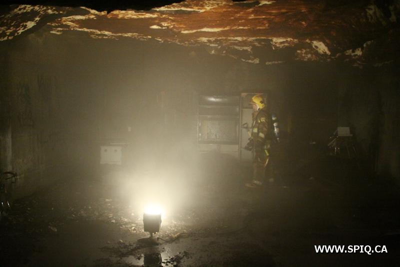 Initialement répartie pour un feu de rebuts, l'intervention prend une toute autre tournure lorsque l'équipe du 201 fait face à la situation. Le feu fait rage dans un stationnement sous-terrain d'un bâtiment de 4 étages, dont l'entrée électrique est attaquée par les flammes. Sans tarder, l'officier du 201 ordonne de compléter une 1ère alarme ainsi qu'un délestage à distance par Hydro-Québec.