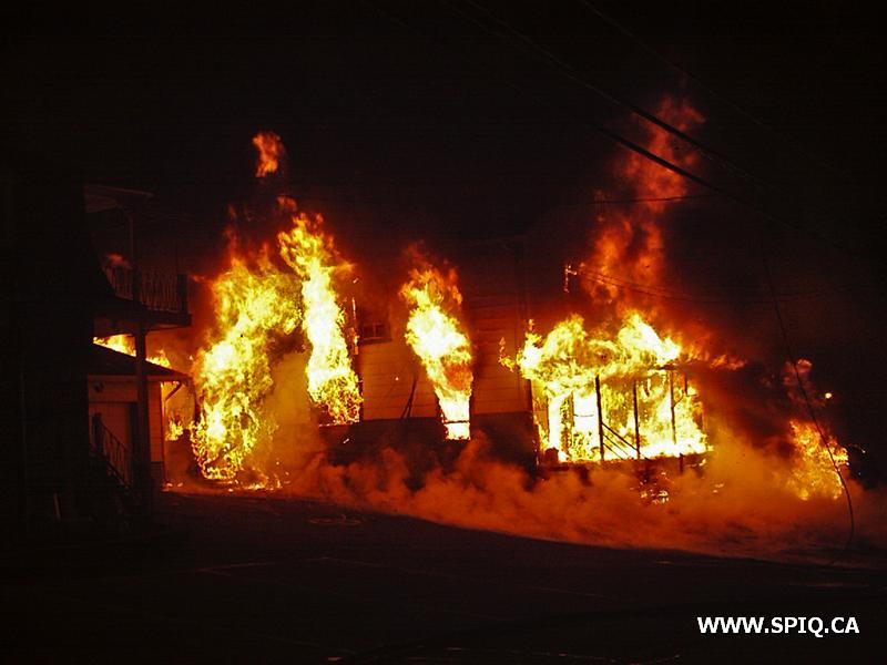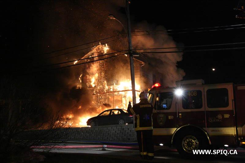 En route, le 216 confirme voir des flammes, le 143 a alors complété la 2ième alarme. À son arrivée le 216 confirme que le feu est éclaté à la grandeur de la maison de deux logements. Compte-tenu de l'intensité du brasier, et du début de la propagation à une maison voisine, la 3ième puis la 4ième alarme ont été demandées. Pendant de longues minutes on croyait qu'une personne manquait à l'appel, mais il était impossible de procéder au sauvetage devant la violence du feu, et finalement personne ne manquait à l'appel. Aussi, du bran de scie avait été utilisé comme isolant dans la structure de la maison, expliquant la virulence des flammes. Le plancher du deuxième étage s'est partiellement effondré en quelques minutes.