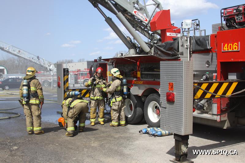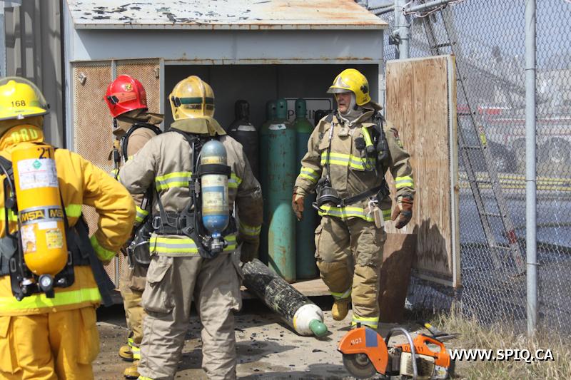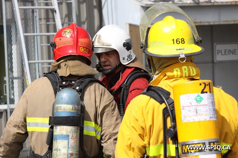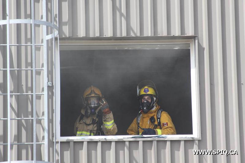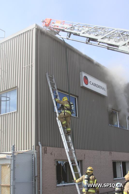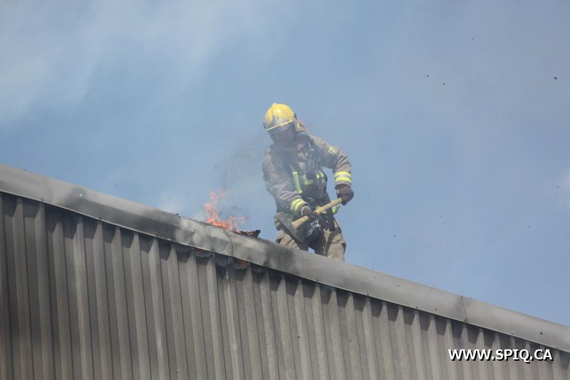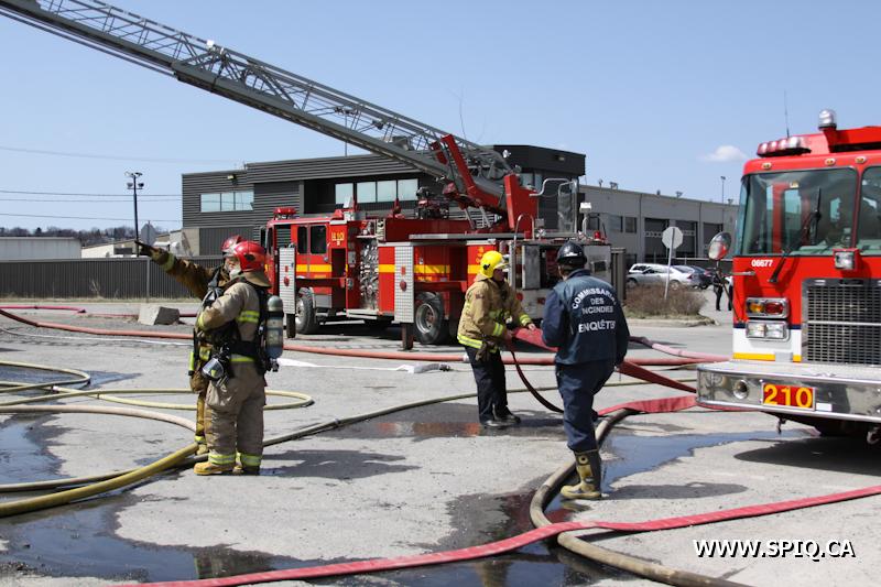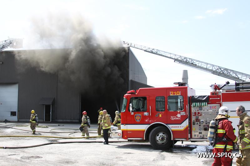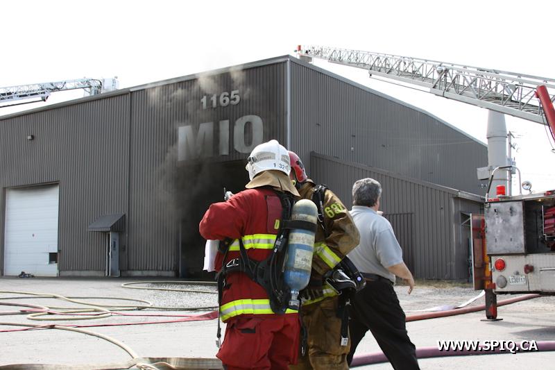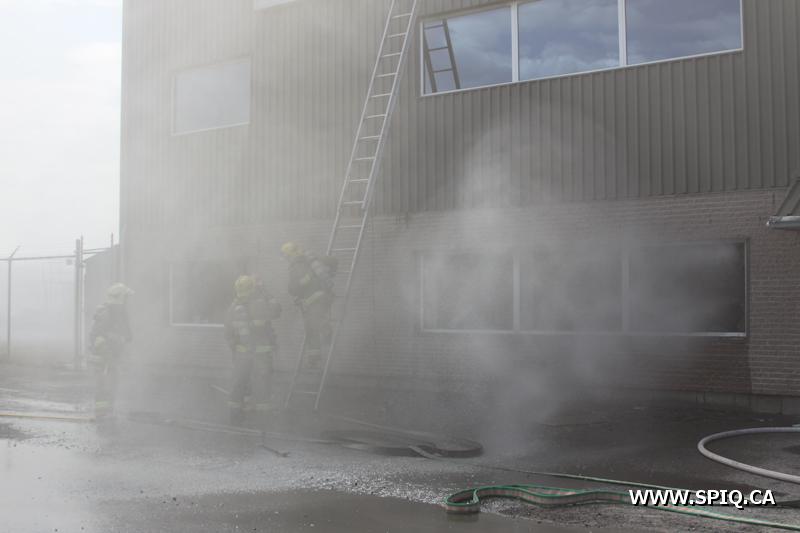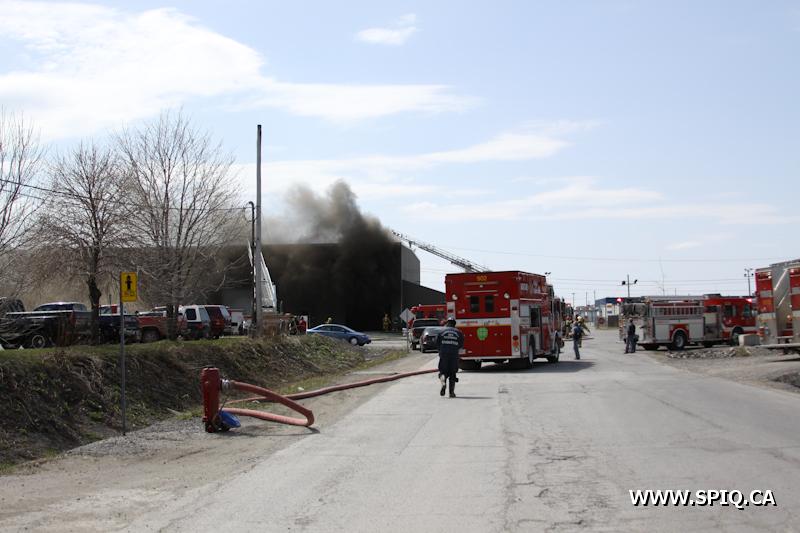 En route pour l'appel, l'officier du 210 signale qu'une énorme colonne de fumée noire est visible. Une 2e alarme est alors ordonnée. Le feu fait rage dans de la machinerie à l'intérieur du bâtiment. La présence de réservoirs de carburant ainsi que de contenants de plastique ne fait qu'alimenter le brasier.