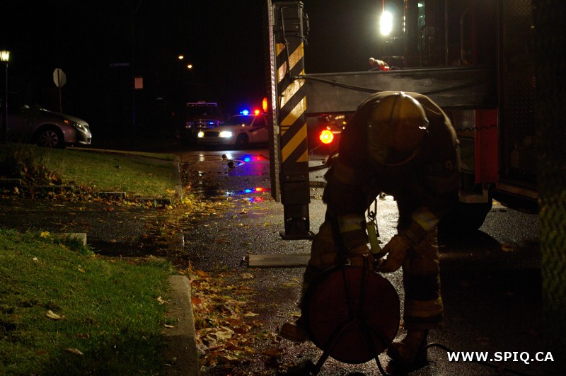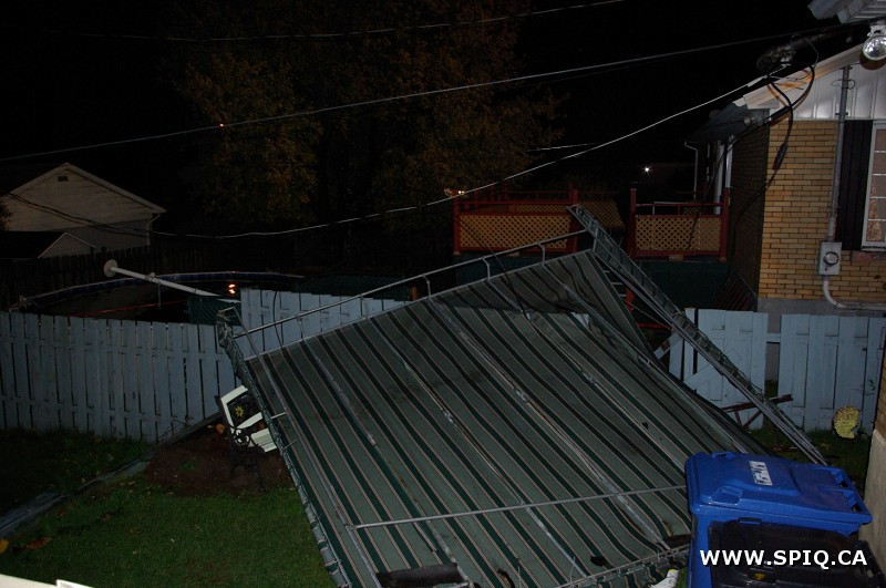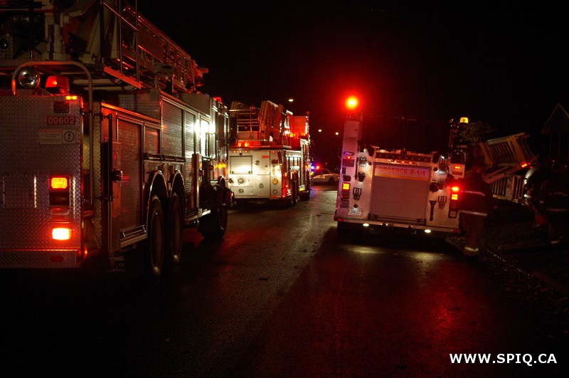 L'appel initial est rentré à la centrale en précisant qu'un abri de patio avait arraché le mât électrique et que le feu serait sur le toit. Plusieurs appels entrent à la centrale, forçant même une autre première alarme sur la rue adjacente.