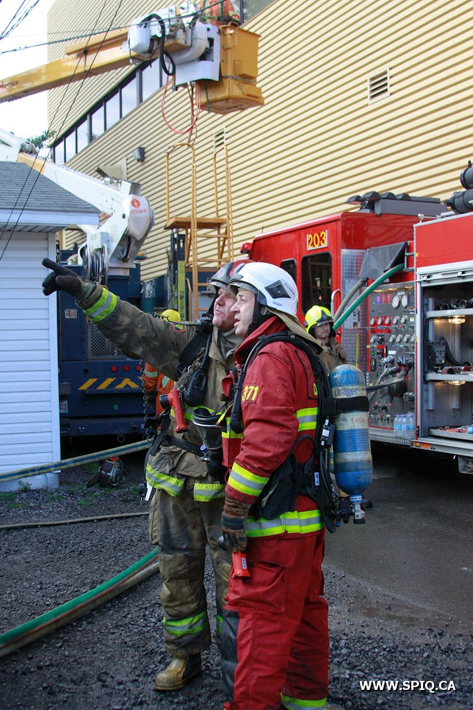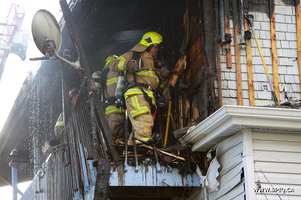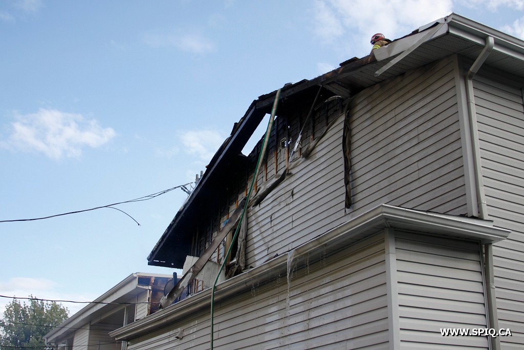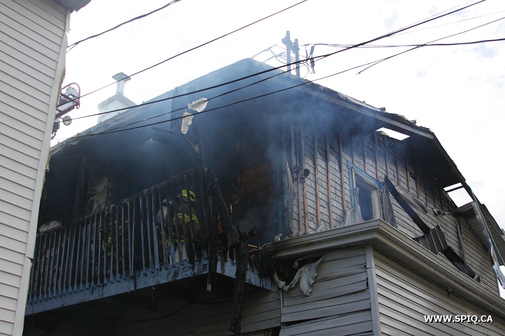 L'incendie s'est déclaré sur la galerie du 2e étage de l'immeuble qui compte quatre logements. Rapidement, les flammes ont fait leur chemin vers le toit par la corniche. Plusieurs appels ont été logés au 911 par les témoins de l'incendie. En route vers l'intervention, l'officier du 204 confirme la colonne de fumée apparente. Rapidement sur les lieux, le chef Messier (112) confirme l'intervention nécessaire. Devant la propagation des flammes, l'intervention montera en 2e alarme.