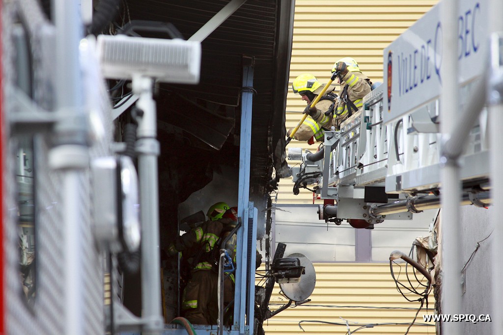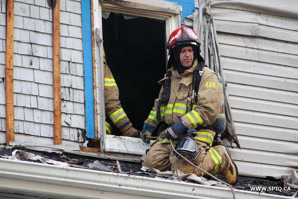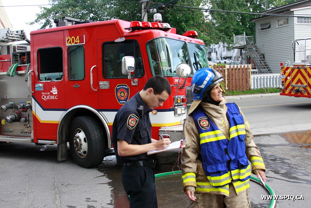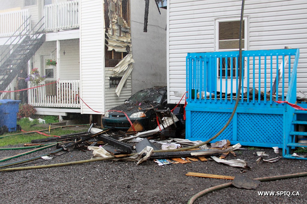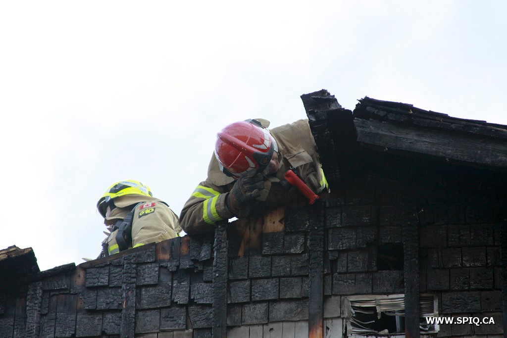 L'incendie s'est déclaré sur la galerie du 2e étage de l'immeuble qui compte quatre logements. Rapidement, les flammes ont fait leur chemin vers le toit par la corniche. Plusieurs appels ont été logés au 911 par les témoins de l'incendie. En route vers l'intervention, l'officier du 204 confirme la colonne de fumée apparente. Rapidement sur les lieux, le chef Messier (112) confirme l'intervention nécessaire. Devant la propagation des flammes, l'intervention montera en 2e alarme.