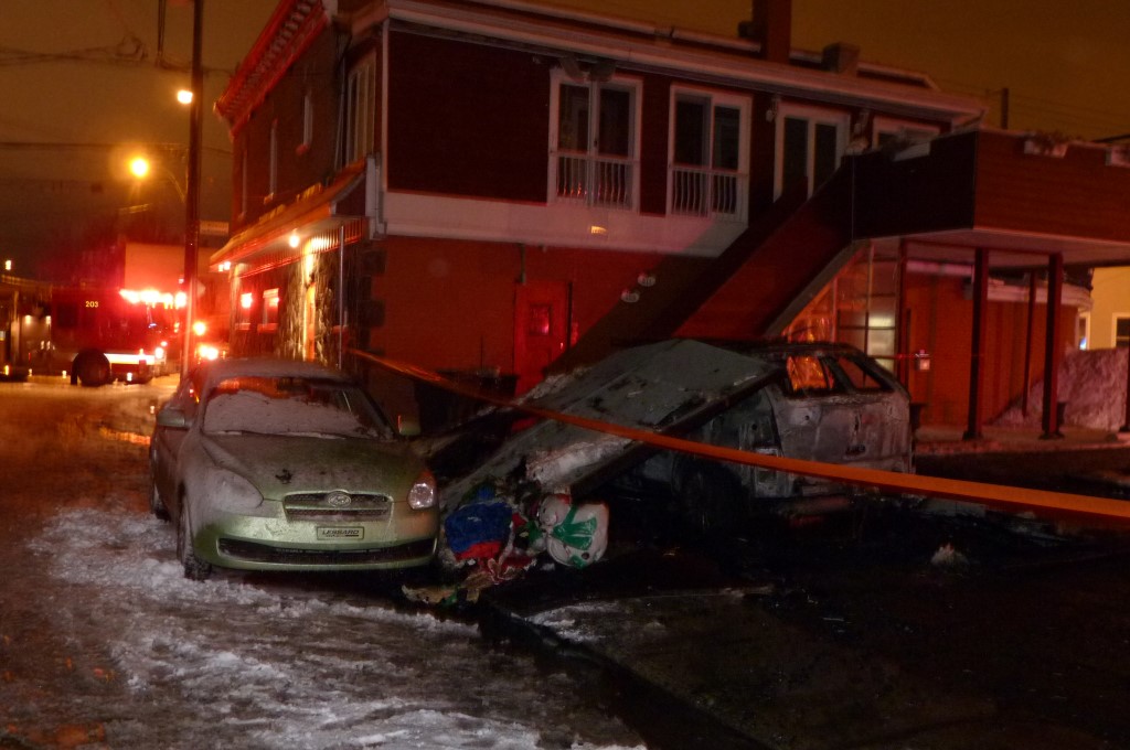 Incendie de véhicule et d'abri temporaire en bois à l'arrière du Bar Le Kirouac.