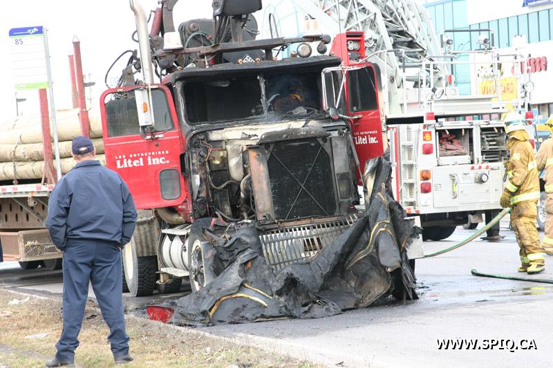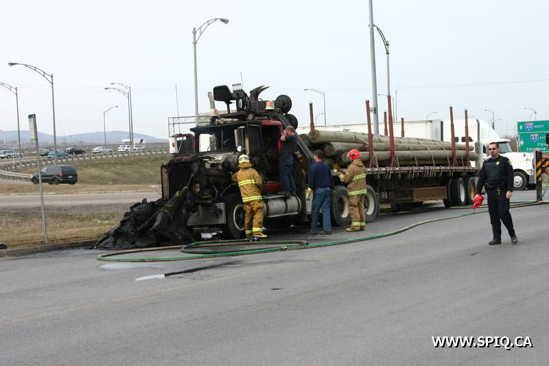 Plusieurs appels entrent à la centrale 911: la cabine du camion est complètement en flammes et la cargaison de bois est menacée. L'équipe du 305 confirme le feu violent et demandent l'assistance des policiers pour faire la gestion de la circulation.