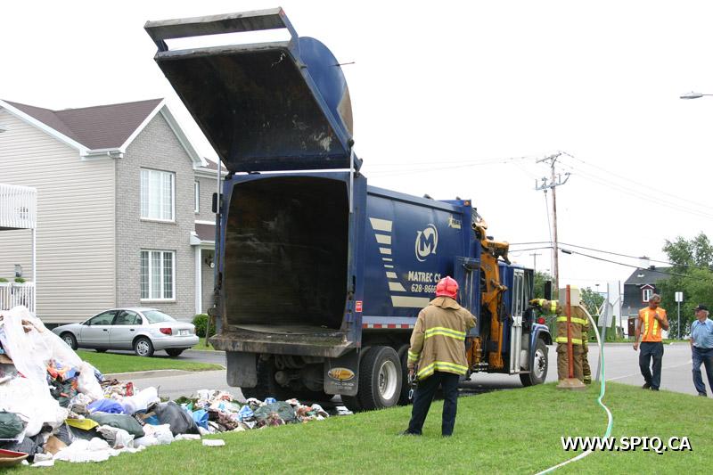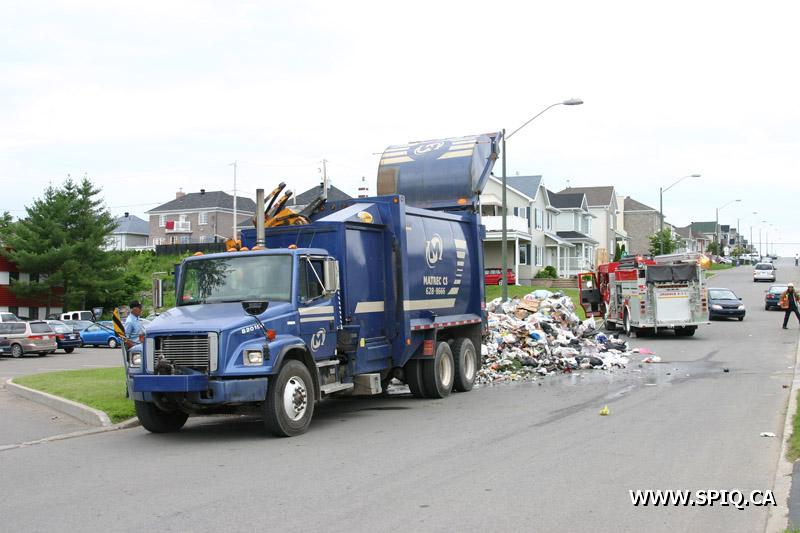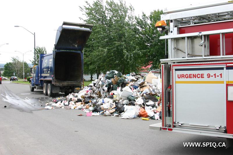 Cet après-midi, sur la rue du Semoir dans l'arrondissement de Beauport, une partie de la cargaison d'un camion a ordures de la compagnie Matrec a été la proie des flammes.