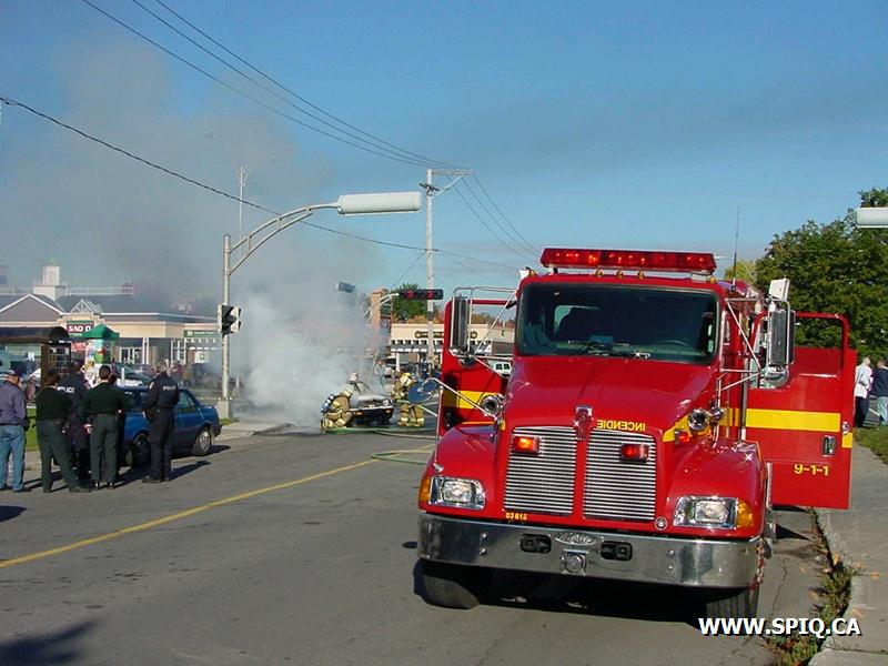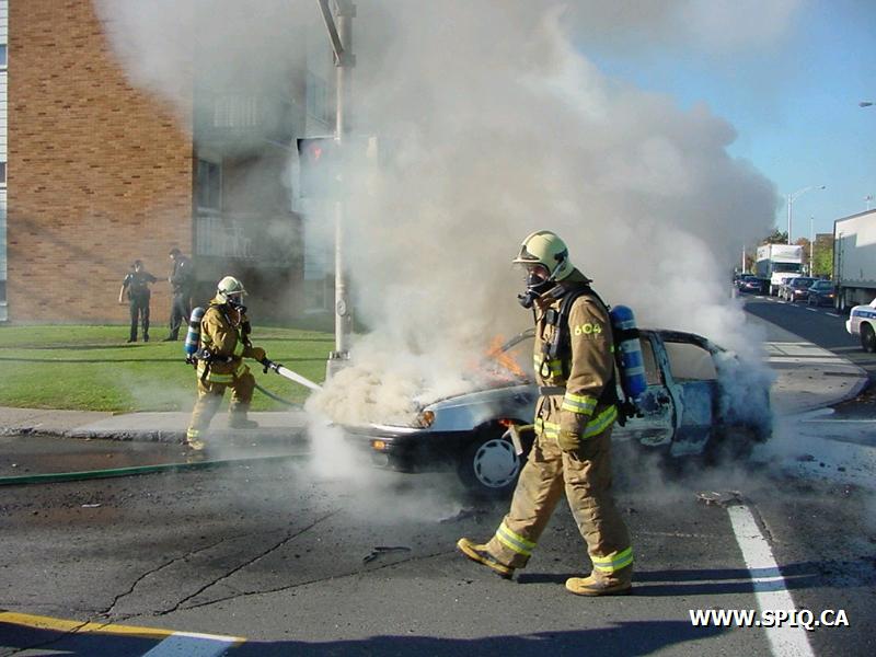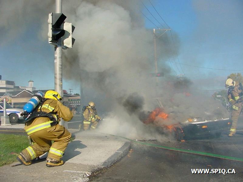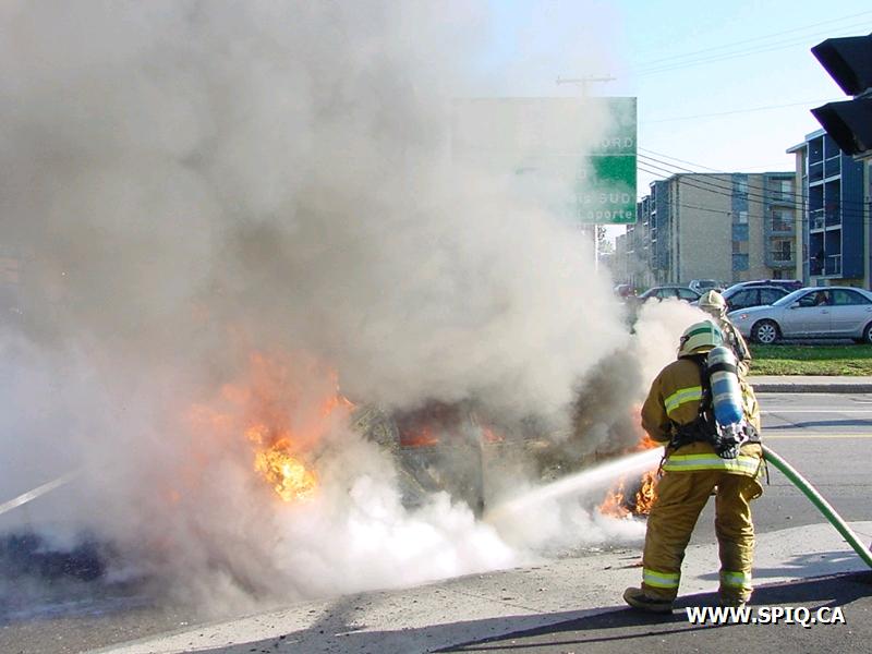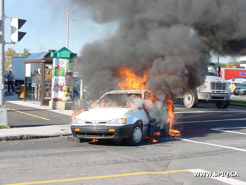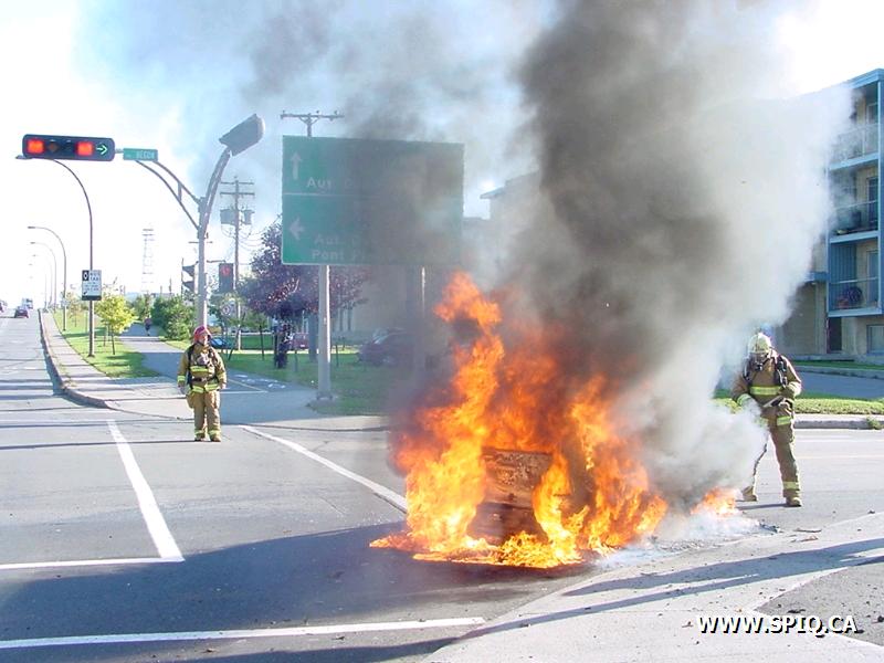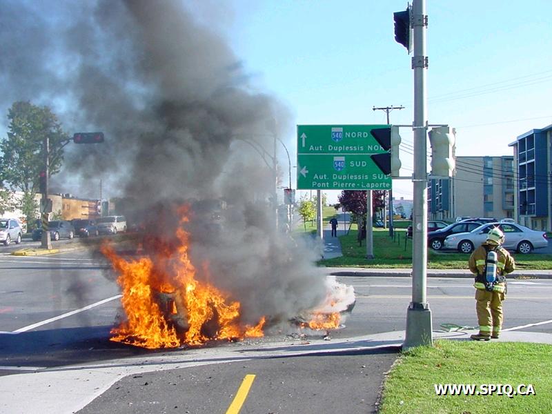 Spectaculaire feu de véhicule à l'heure de pointe du matin à l'intersection de la rue Bégon et du Chemin-des-Quatre-Bourgeois: la colonne de fumée noire était visible de partout à la ronde en raison d'un ciel bleu et très clair.
