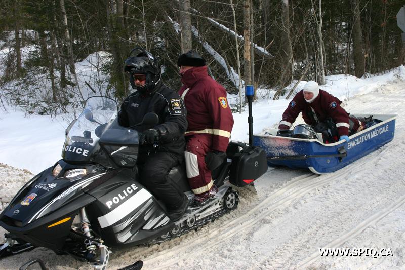 Les véhicules tout-terrain du SPCIQ ainsi que des policiers ont été mis a contribution pour effectuer le transport des ambulanciers vers le lieu de l'accident.Malgré les difficultés de communication radio causées par l'éloignement géographique de l'accident, les opérations de récupération du motoneigiste blessé se sont très bien déroulées.
