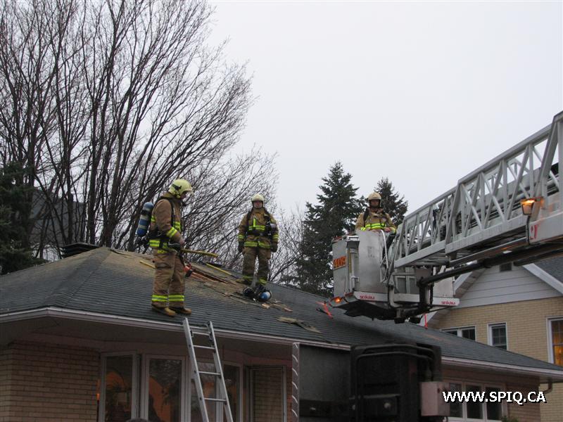 Feu de cheminée, le résident appel pour signaler la présence de fumée dans l'entretoit. Après vérifications, les pompiers constatent qu'il y a un feu de cheminée et qu'il y une propagation de l'incendie dans le mur et l'entretoit. le ventilation au toit est faite avec une ouverture 4X4 pieds.