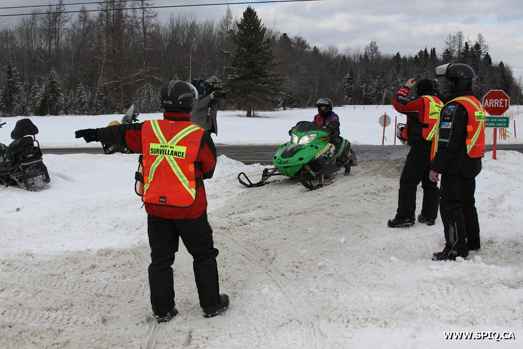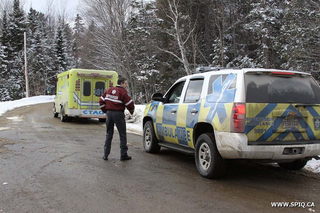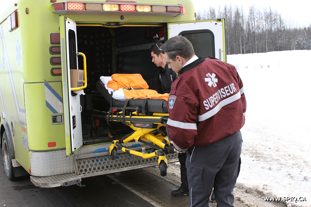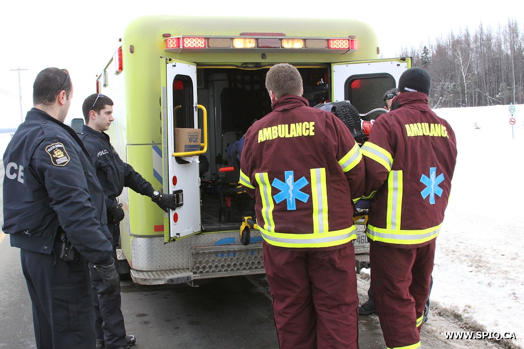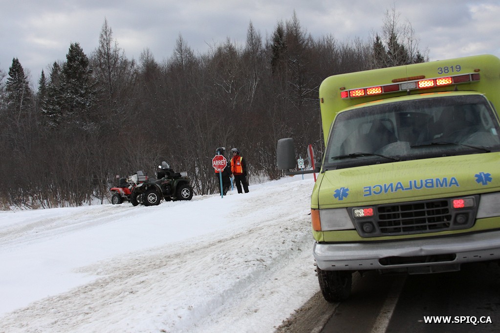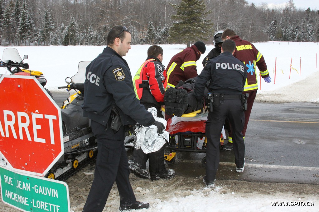 Les pompiers et ambulanciers qui parcourent le sentier en direction de l'accident demandent alors aux policiers de se déplacer à nouveau afin de faciliter le transport du blessé. C'est finalement sur la Route Jean-Gauvin, à l'intersection du sentier de motoneige no.3, que tous les intervenants vont se retrouver pour le transport du blessé.