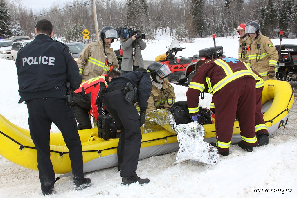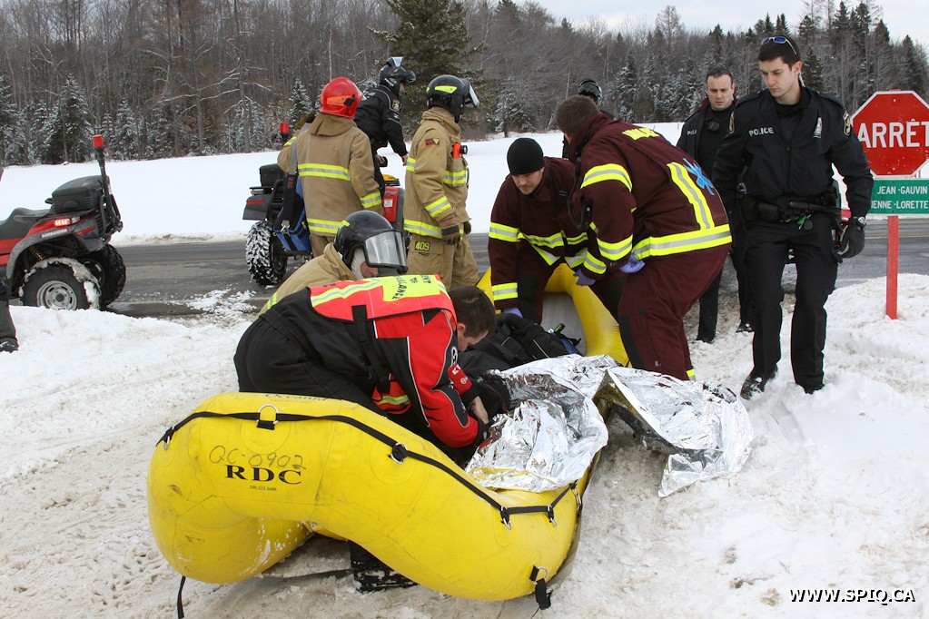 Pendant ce temps, les pompiers, ambulanciers, ainsi que des bénévoles du Club Motoneige Jacques-Cartier tentent d'immobiliser la victime sur une planche dorsale, pour éventuellement faciliter son transport dans une embarcation Fortuna tirée par une motoneige. Le blessé a été pris en charge par les ambulanciers et transporté dans un centre hospitalier de la région.
