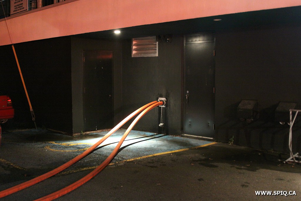 Une équipe BGH fera les raccords nécessaires à un cabinet armé du 4e étage. Malgré le fait que le feu sera éteint très rapidement, les dommages au local seront considérables. Les vérifications permettront de valider qu'aucun dommage n'a été fait à la structure.