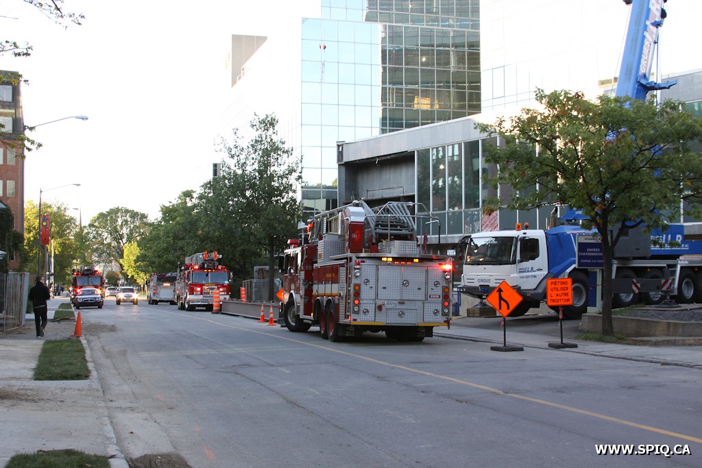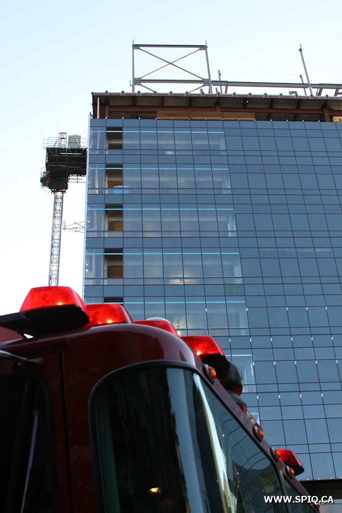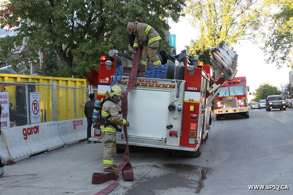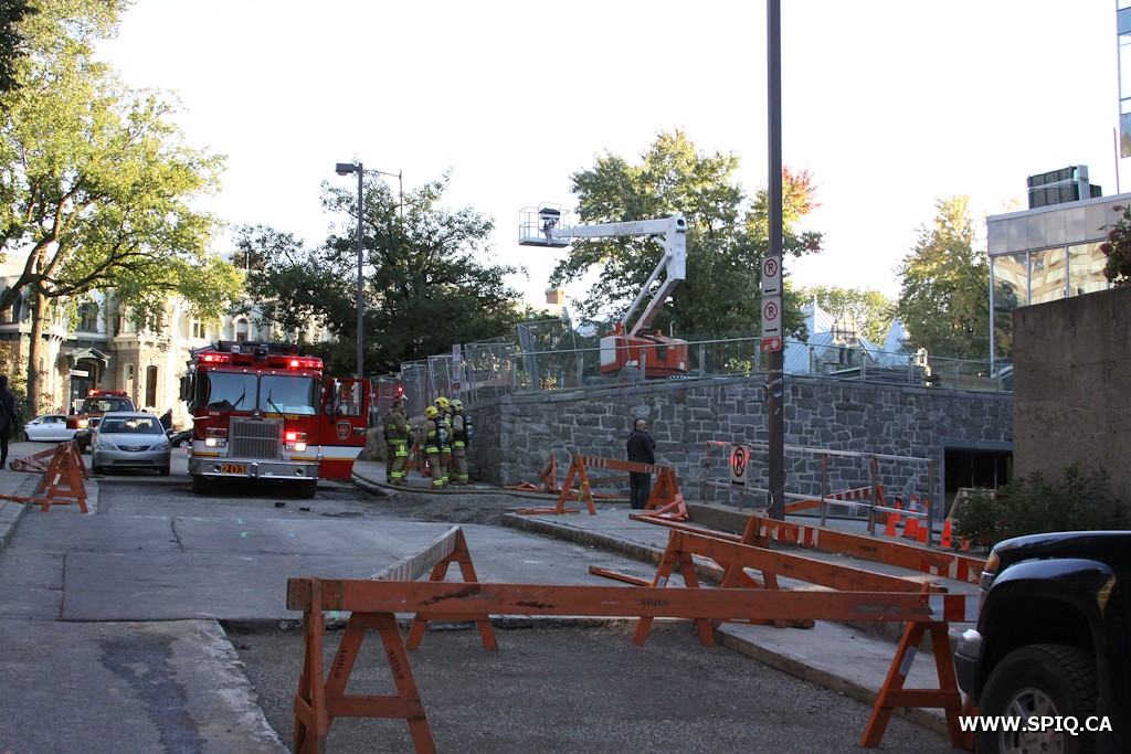 Ce sont des ouvriers, présents sur le chantier de construction de l'ancien bâtiment de la Banque Laurentienne, qui ont alerté la centrale 911 pour signaler le début d'incendie. Selon les informations, le feu consume le matériel isolant d'une tuyauterie. Au tout début de l'intervention, le panache de fumée est visible de l'arrondissement Beauport. Même le Chef Messier (113) confirme la fumée apparente alors qu'il se trouve en route vers l'intervention.