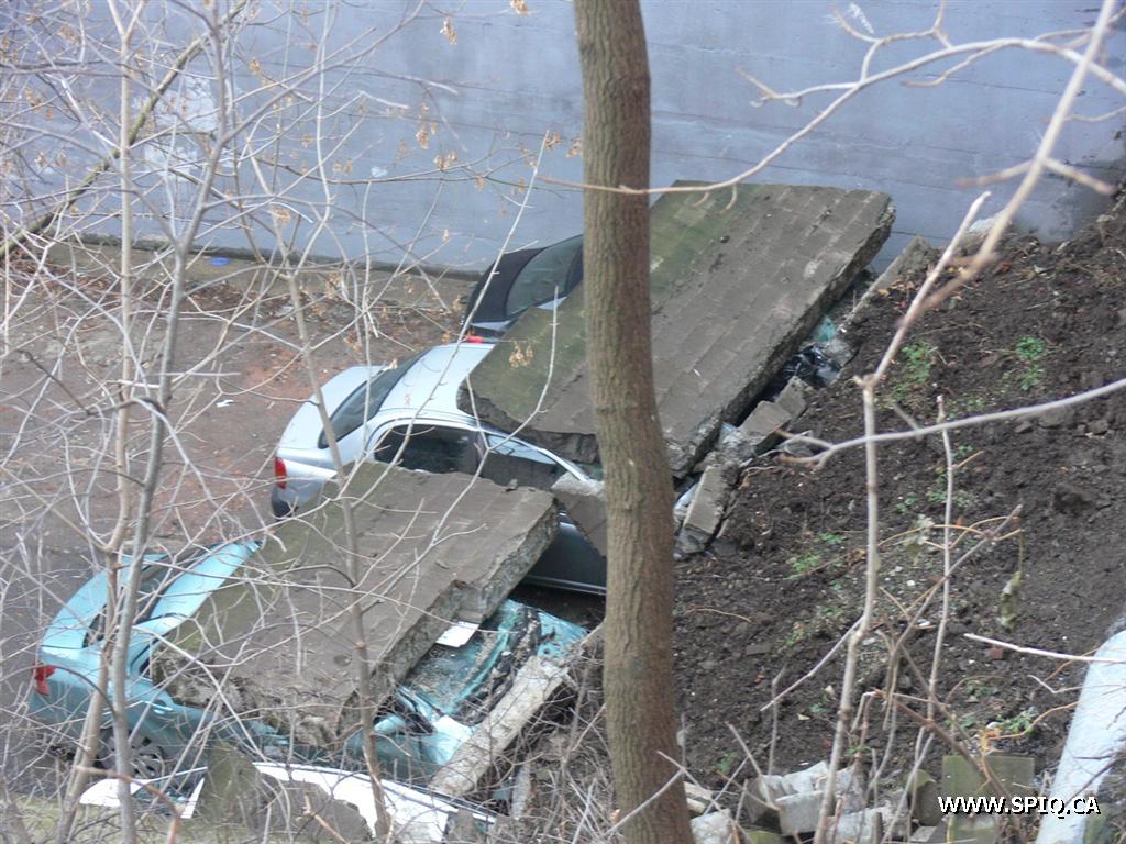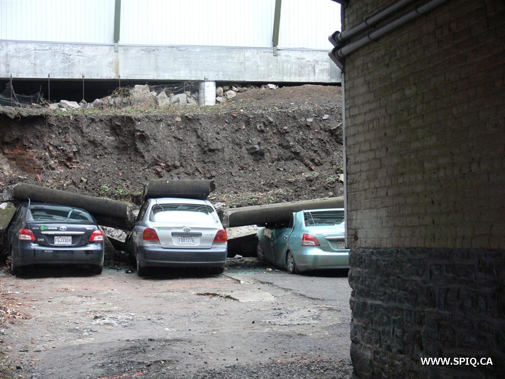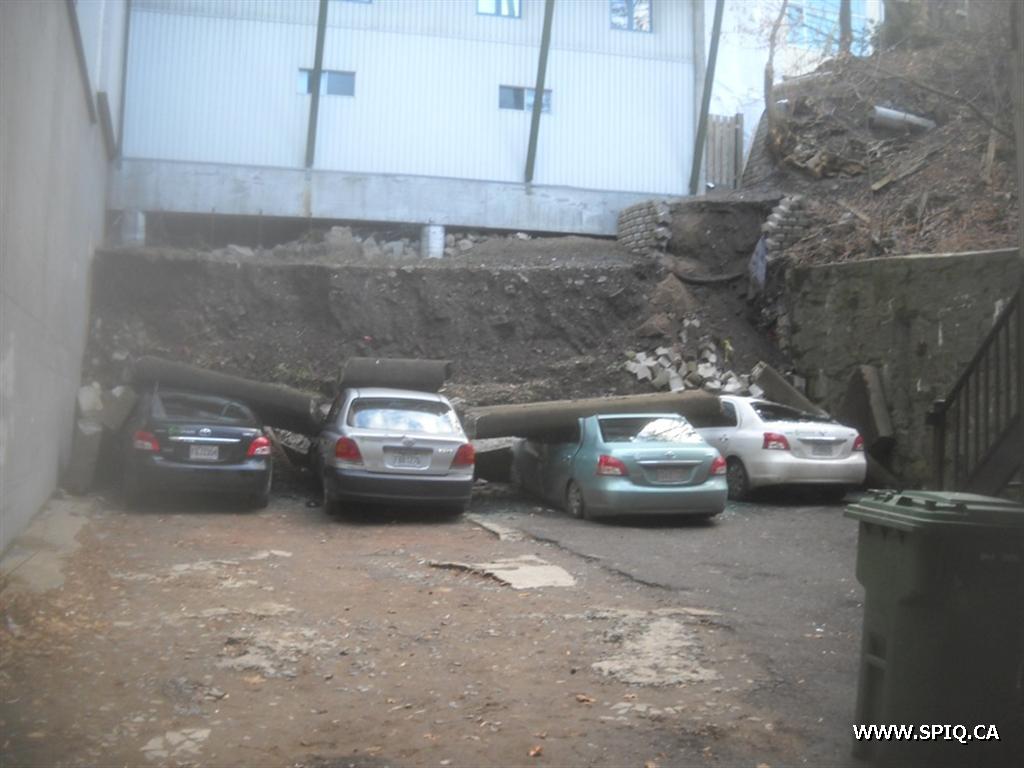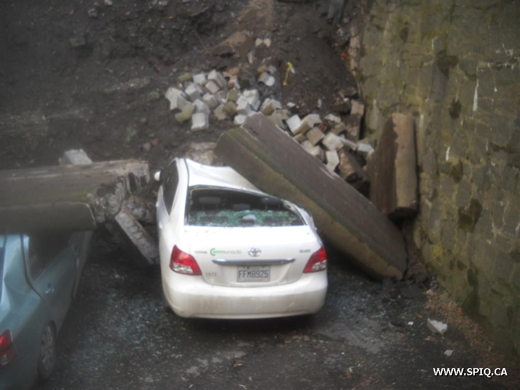 Un effondrement de mur est survenu à l'arrière du 295 rue St-Jean. Quatre autos de Communauto ont été ensevelies sous le béton. Un bâtiment de 5 condos situé sur la rue Lockwell a dû être évacué par mesure de sécurité car les gens et les pompiers entendaient des craquements inquiétants. Le tout a été remis entre les mains du propriétaire du 295 St-Jean qui a fait venir un ingénieur en sol. C'est l'équipe du 203 qui a répondu à cet appel.