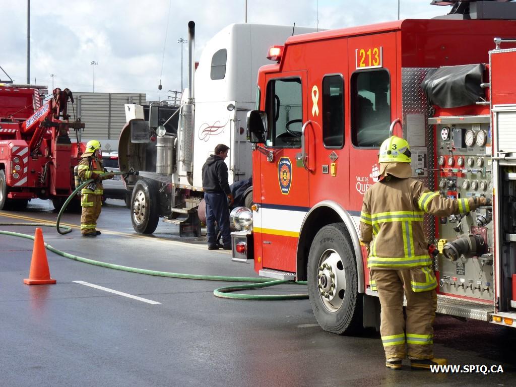 Le tracteur d'un semi-remorque a pris feu alors qu'il était sur la Rue Marais à la hauteur de la sortie de la Capitale est.