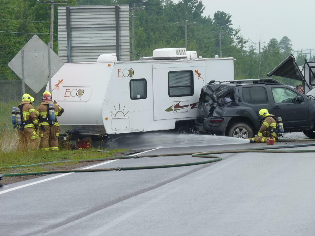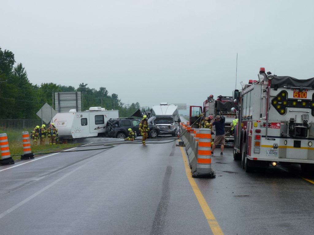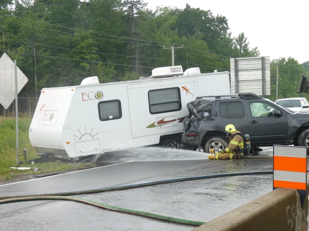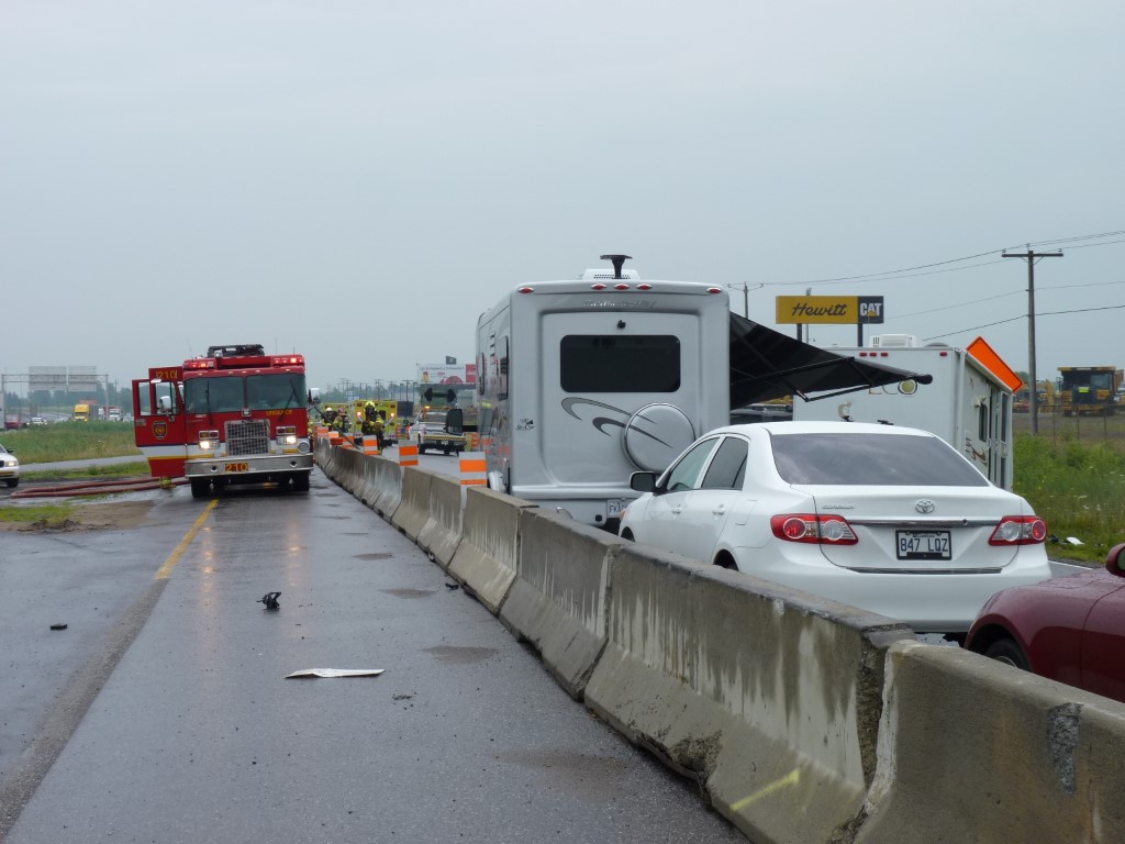 Une roulotte tirée par une véhicule utilitaire a fait une mise en portefeuille et un petit véhicule récréatif n'a pu l'éviter, de sorte que les 2 voies de circulation et l'accotement ont été complètement bloqués. Deux bombonnes de propane de vingt livres se sont détachées de la roulotte et commencé à fuir.