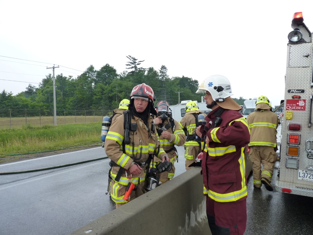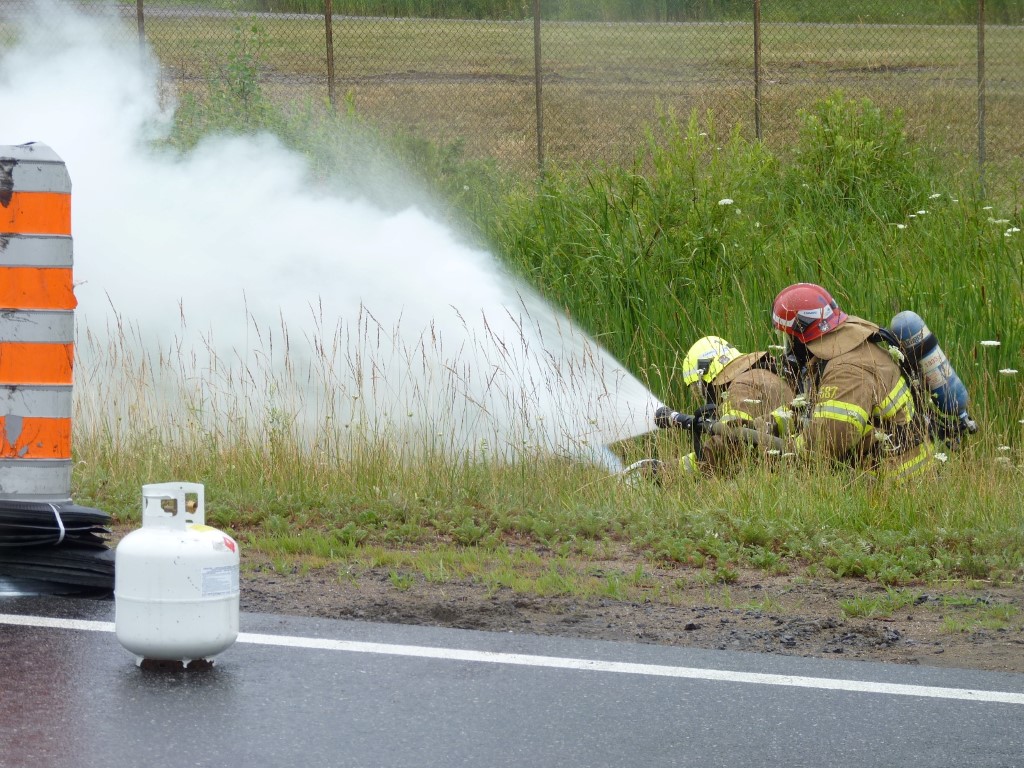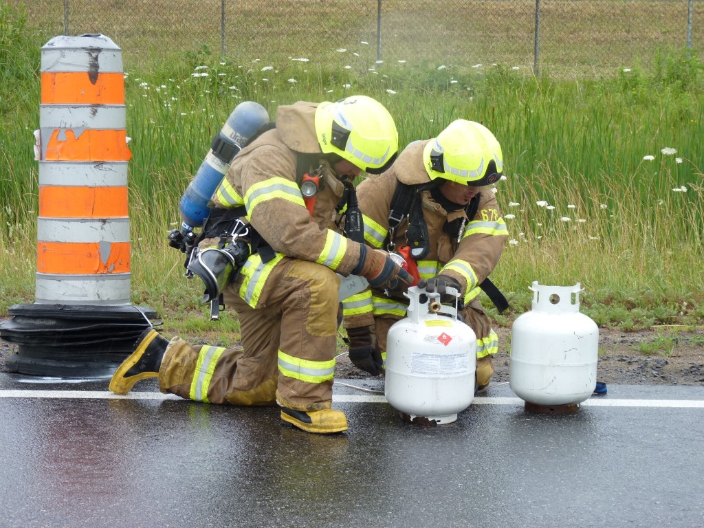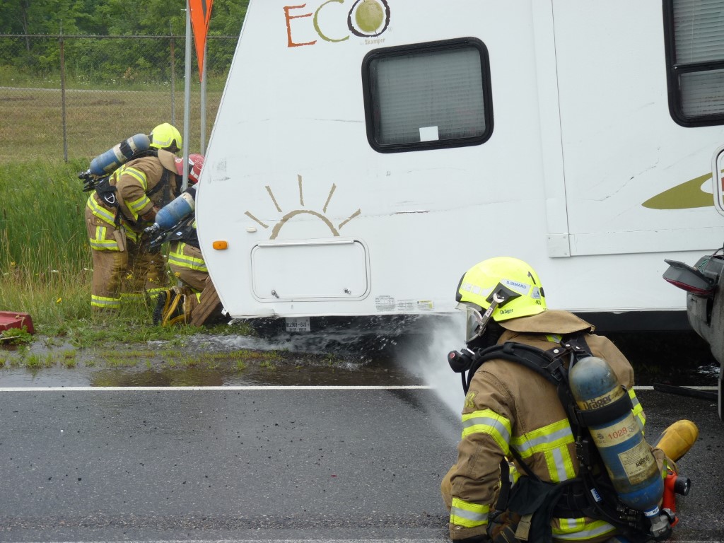 Une roulotte tirée par une véhicule utilitaire a fait une mise en portefeuille et un petit véhicule récréatif n'a pu l'éviter, de sorte que les 2 voies de circulation et l'accotement ont été complètement bloqués. Deux bombonnes de propane de vingt livres se sont détachées de la roulotte et commencé à fuir.
