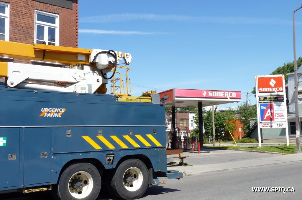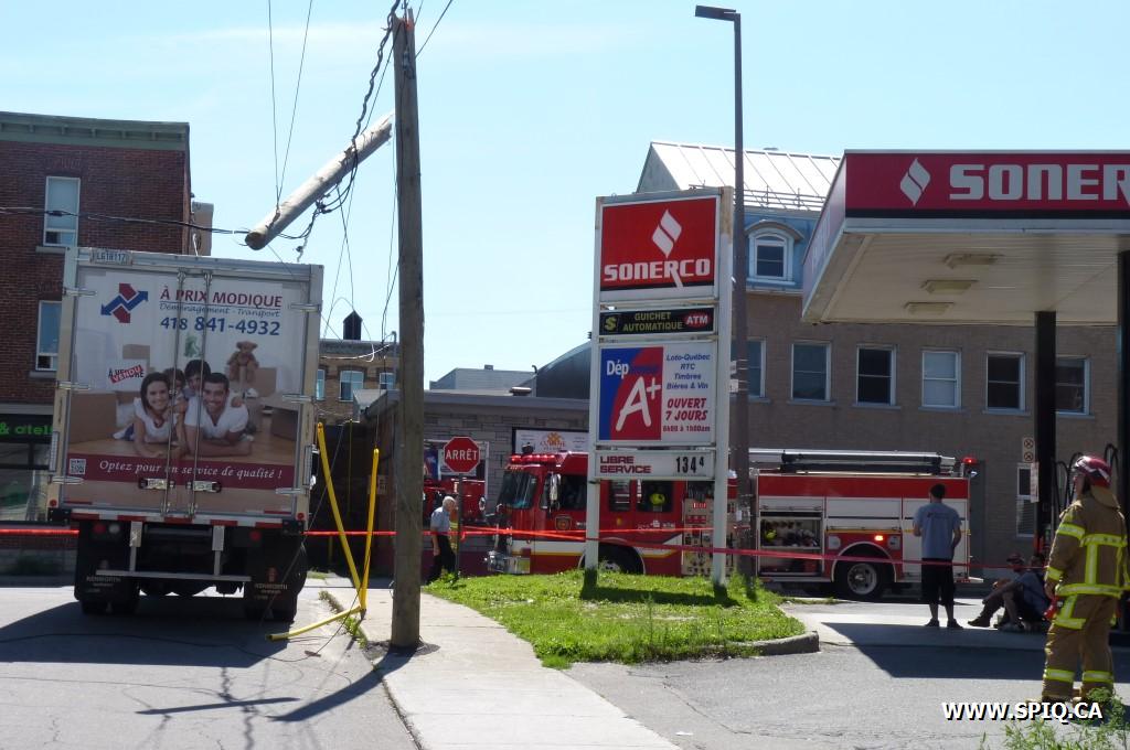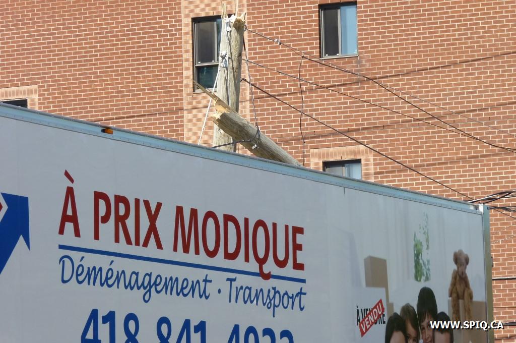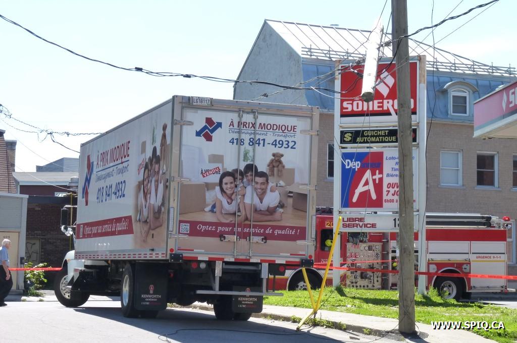 Accident inusité sur la Rue Renaud à la hauteur de la Rue St-Vallier Ouest. Un camion de déménagement a accroché des fils électriques et s'est enchevêtré dans ces derniers après que le poteau qui les transportait se soit cassé. Une panne locale s'en est suivie.