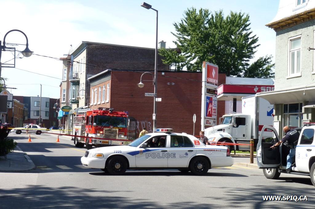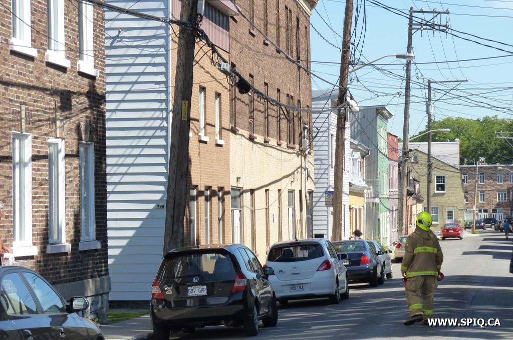 Les pompiers ont établi un large périmètre de sécurité et la Rue Saint-Vallier a été fermée dans les deux directions jusqu'à ce que l'équipe d'urgence d'Hydro-Québec ait rétabli la situation.