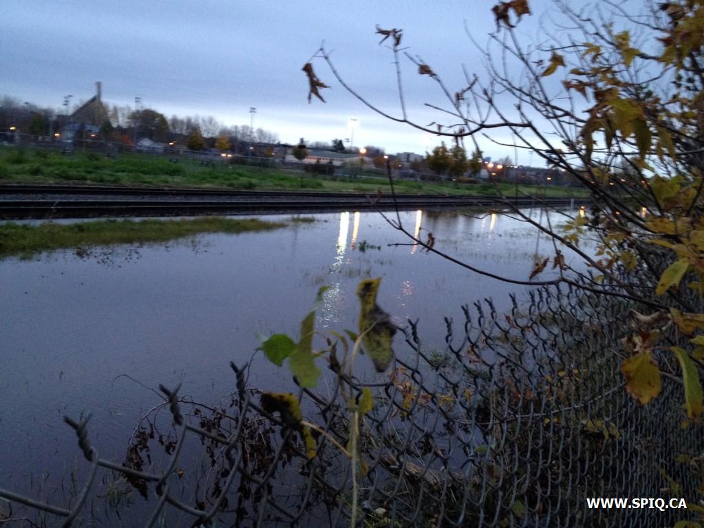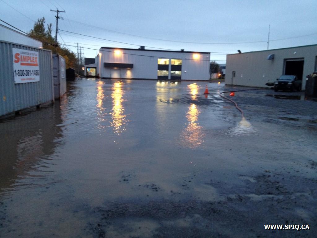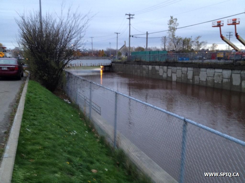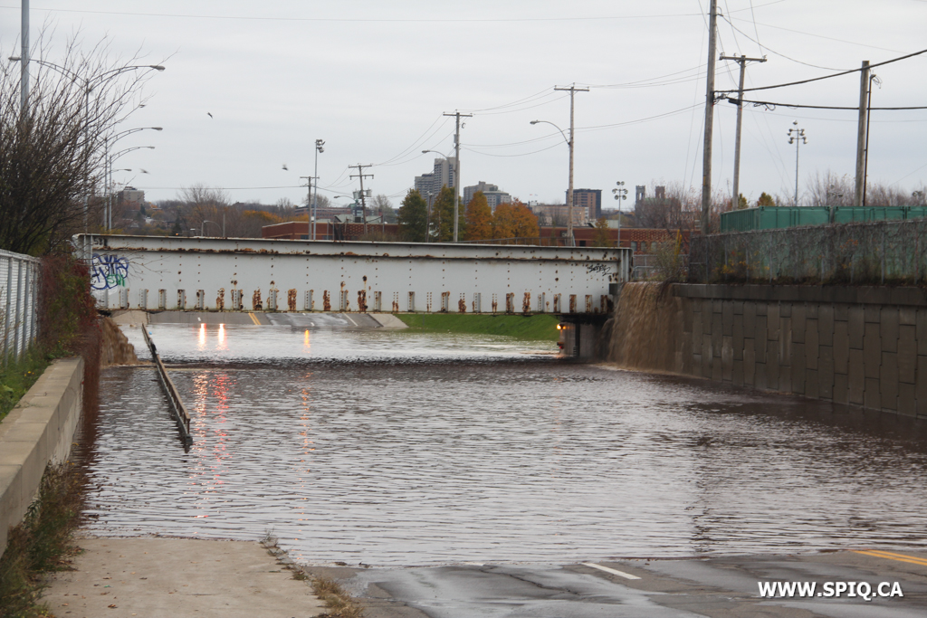 La fuite d'eau a vite fait d'envahir l'espace sous le viaduc du CN, sur Pierre-Bertrand et sur les terrains de quelques commerces dans le secteur ouest de Pierre-Bertrand.