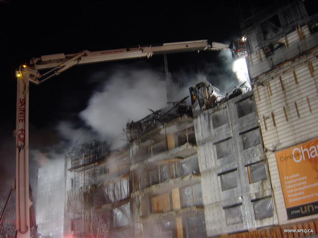 À 18:29: 2300 Avenue Chapdelaine, zone 9-5. Immeuble à logements de plusieurs étages en construction. Le feu s'attaque aux formes de bois à l'étage supérieur. Spectaculaire incendie de 3 alarmes: peloton 4. Cause indéterminée.