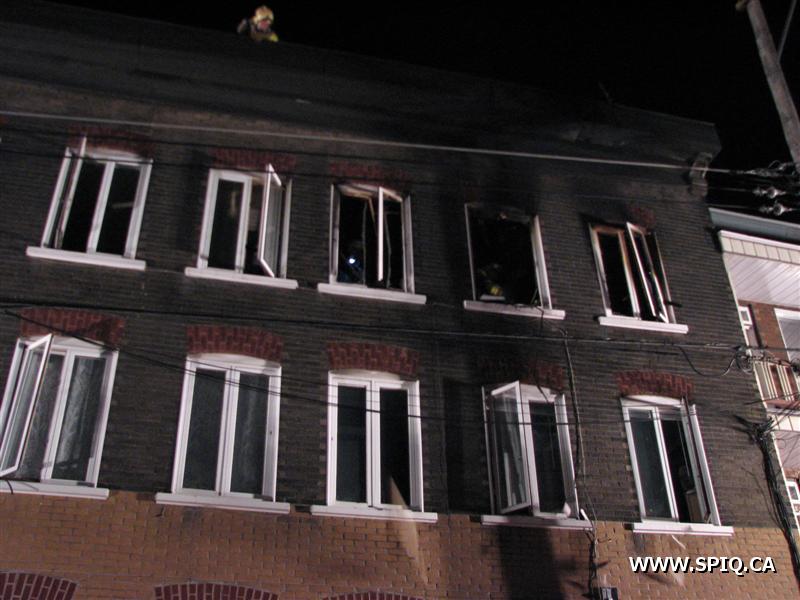 Incendie criminel de 3 alarmes au 75-79 Hermine. Les dégats s'élèvent à 105,000$ et les pompiers demeurent sur place pendant près de 5 heures.