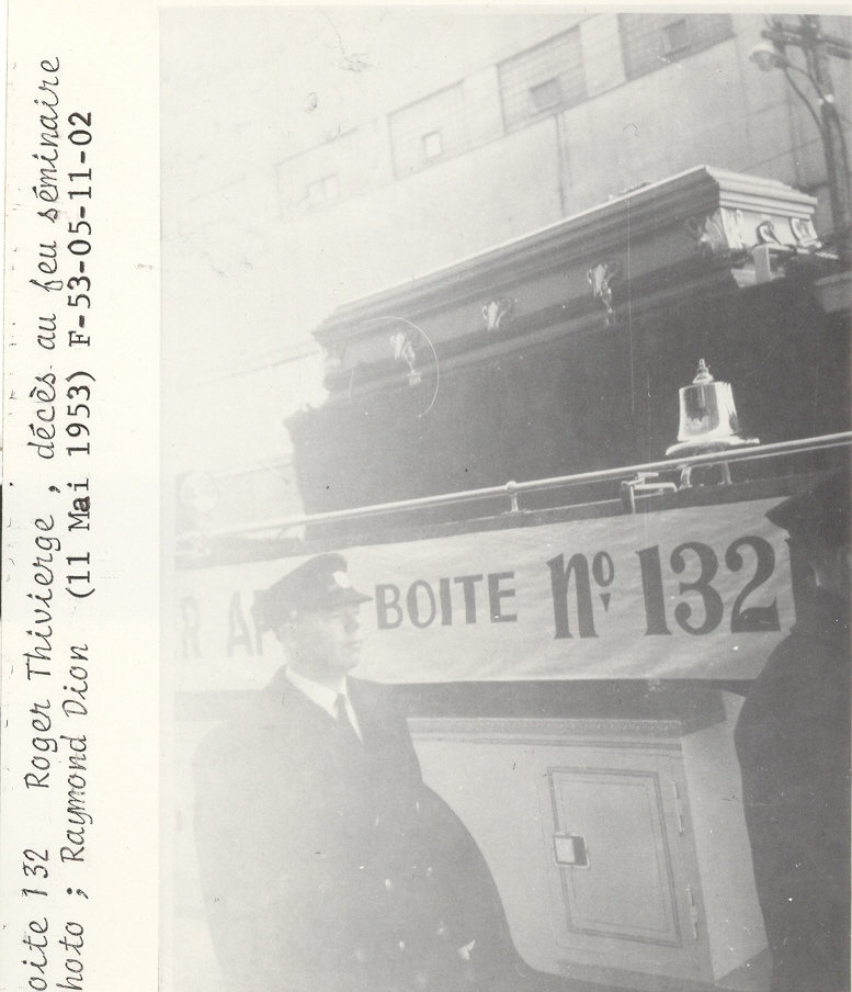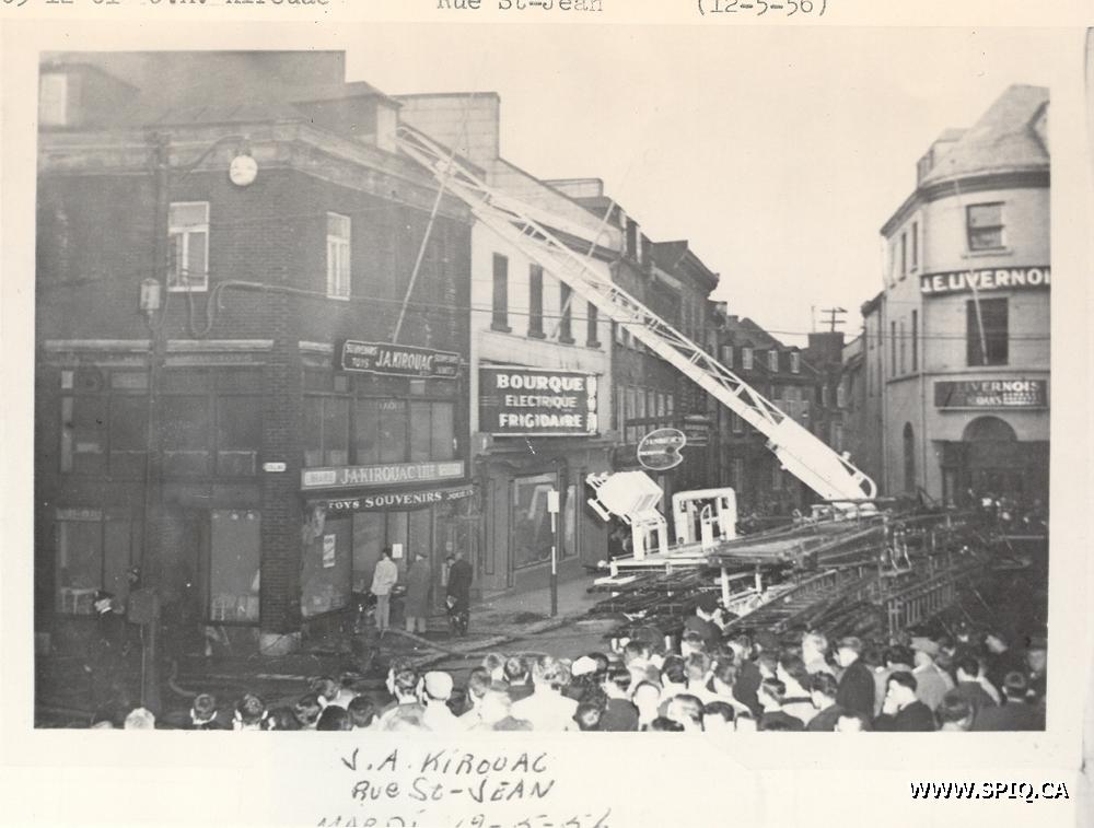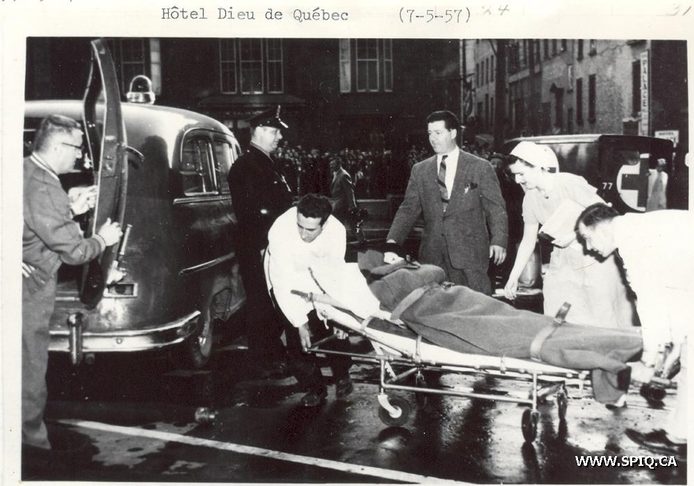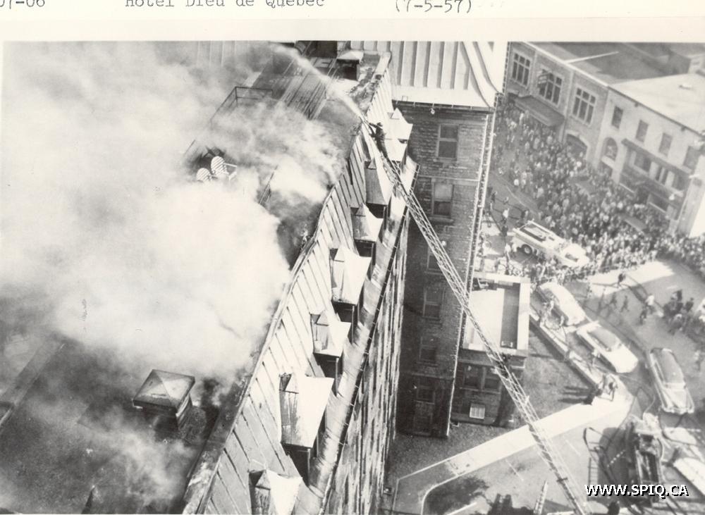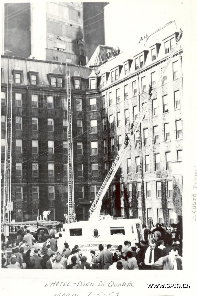 Hôtel Dieu de Québec. Côte du Palais: 309,109$, pipe ou cigarette. Des dizaines de malades ont dû être evacués par ambulance dans les autres hôpitaux de la ville, ce qui se traduisait par un incessant bruit de sirères tout au long du feu.