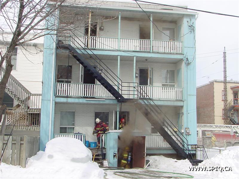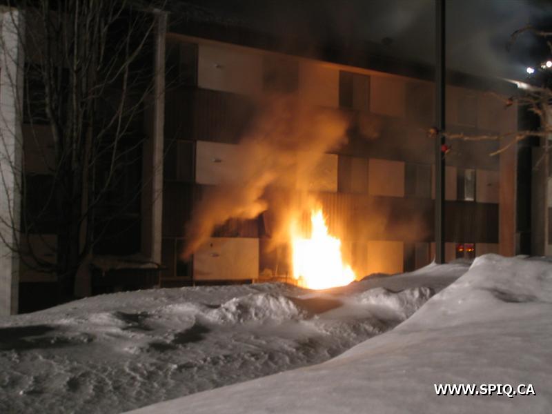 À 05:20: 107 Johnny-Parent, zone 14. Feu éclaté dans un logement du sous-sol de l'immeuble de 24 logements: criminel. Peloton 1.